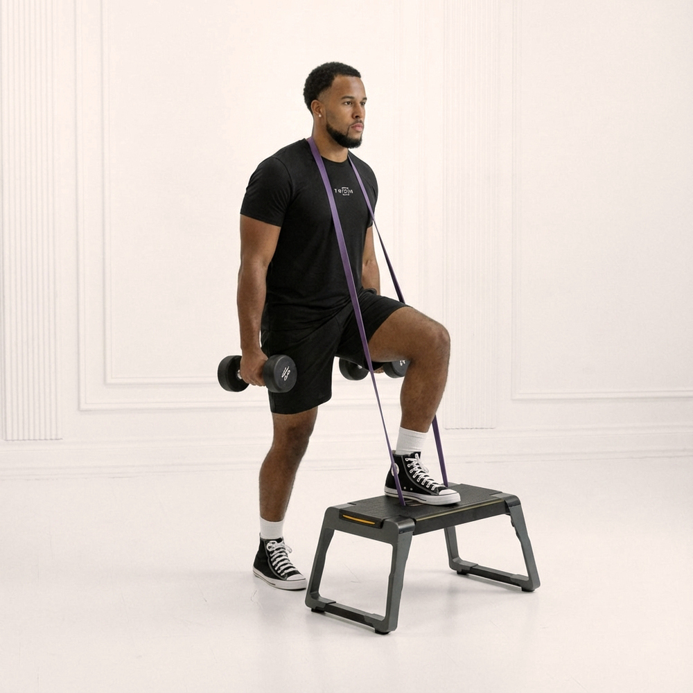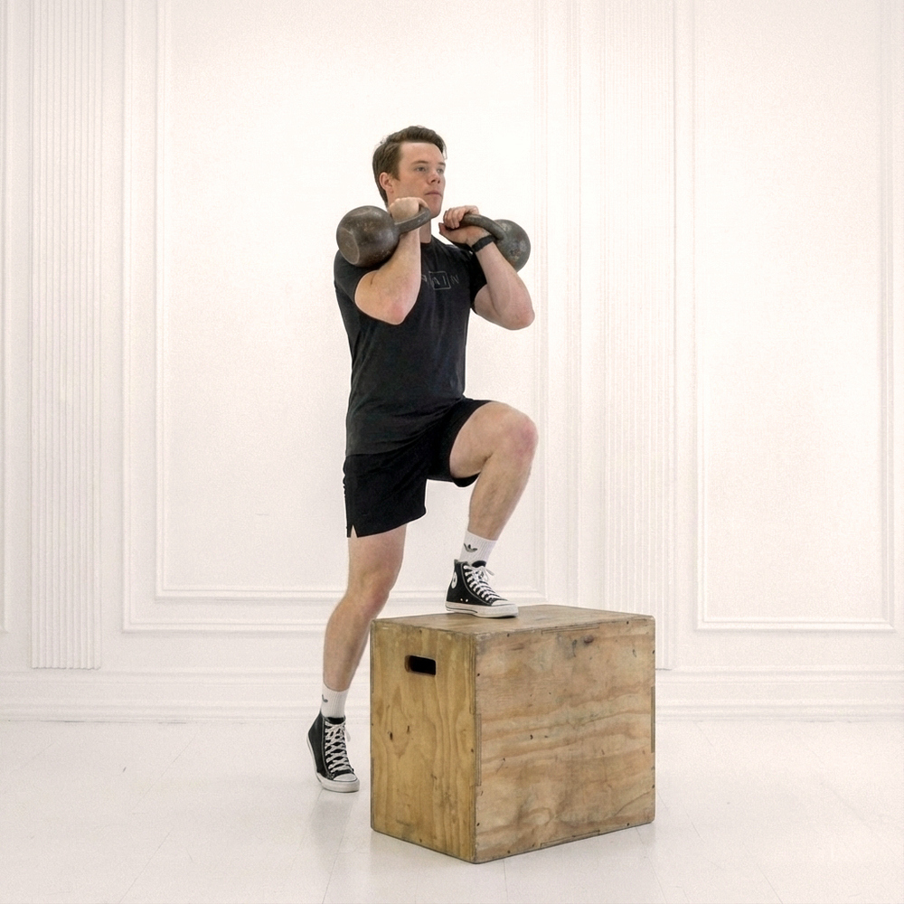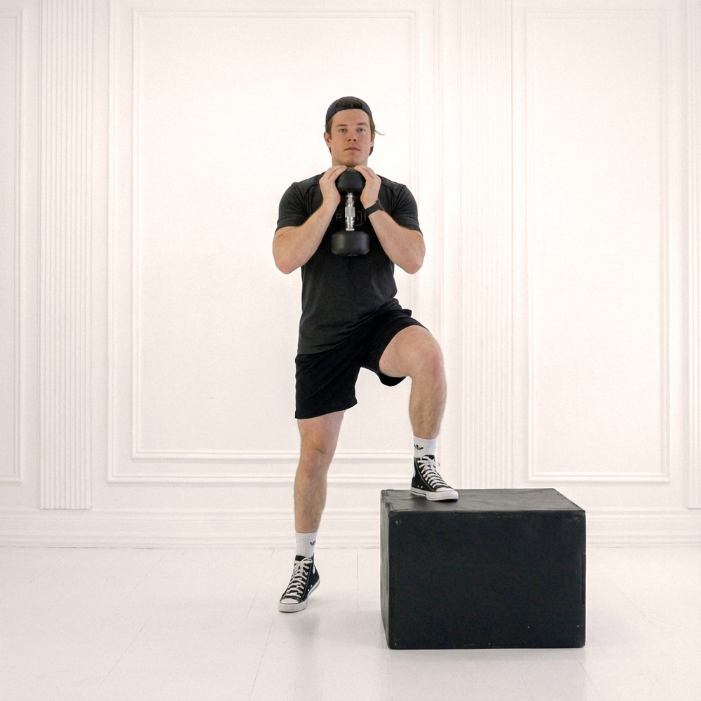 Unilateral lower body exercise where you step onto a box holding dumbbells to target quads, glutes, and hamstrings; builds strength, balance, and corrects imbalances; scaled by box height and weight.
