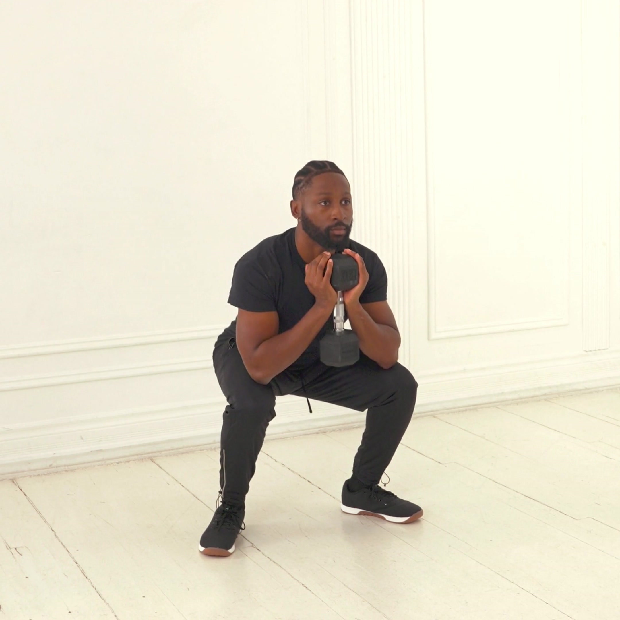 Stand facing a knee-height sturdy box, holding a dumbbell in each hand at your sides with palms facing in. Feet hip-width apart, chest up.