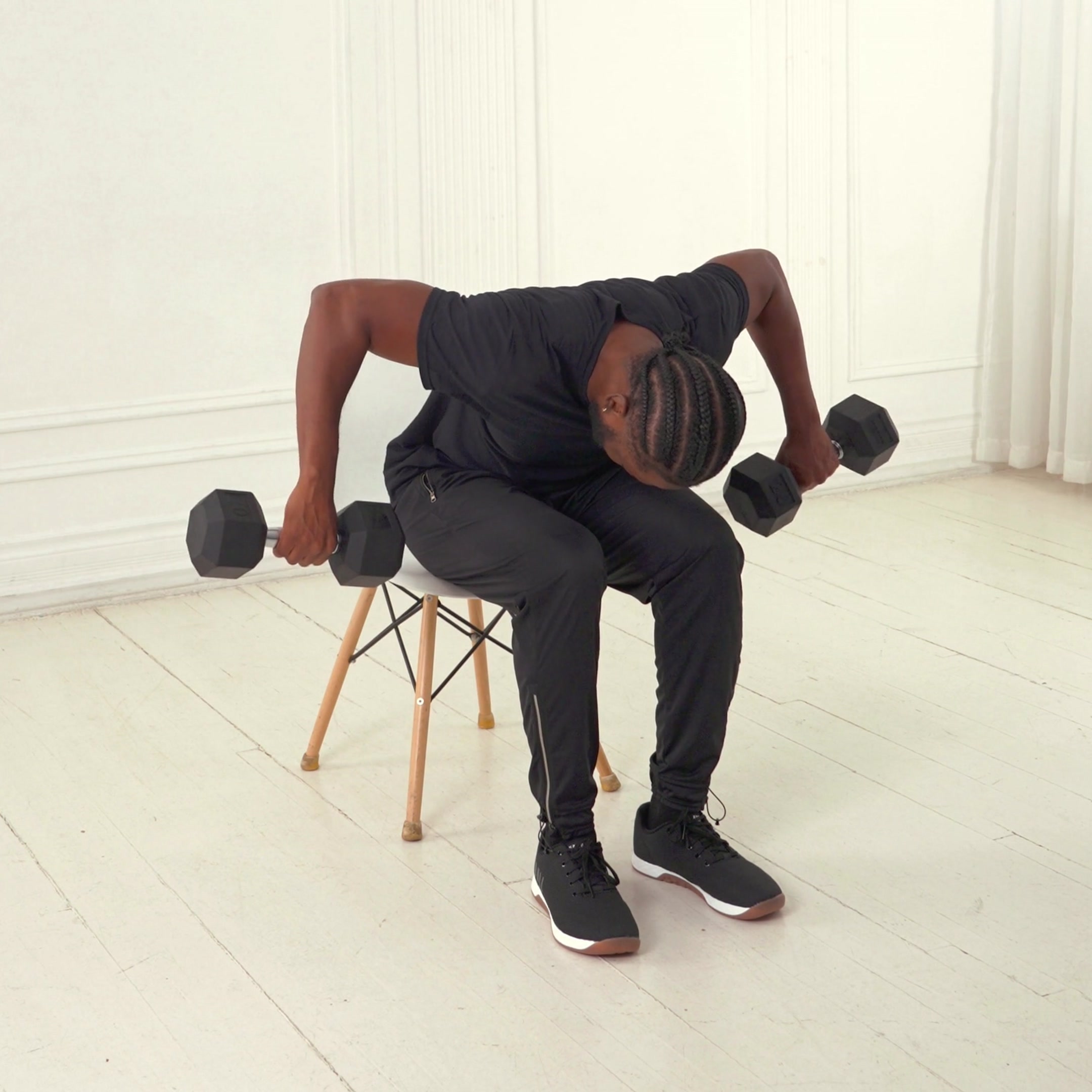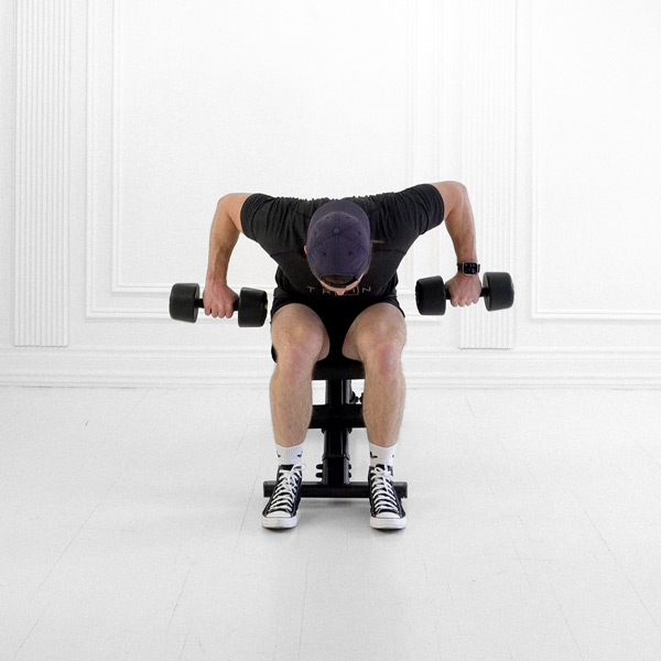 Pull until elbows at or below shoulders dumbbells to mid-chest; lower to full arm extension at thighs.