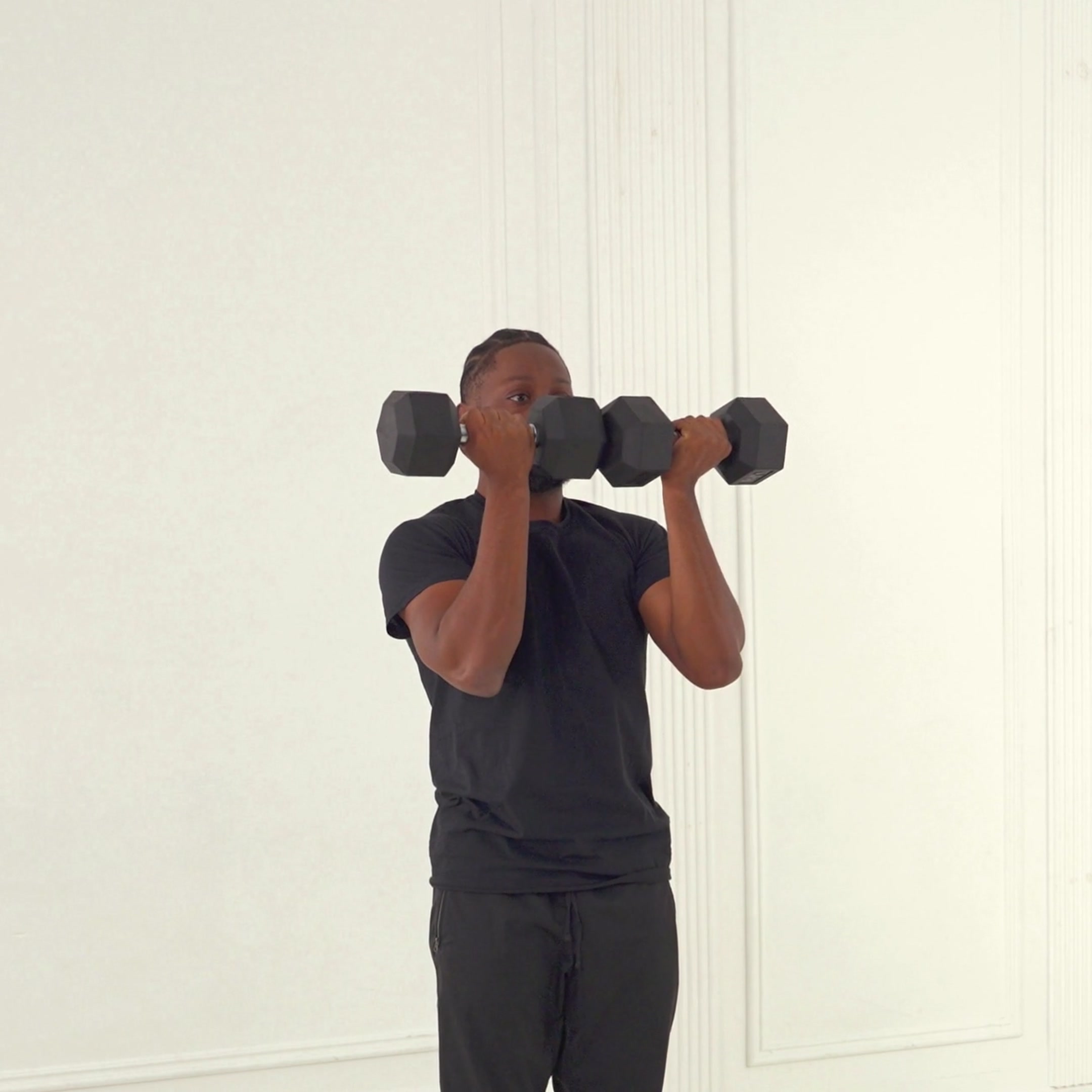 Sit on the floor with legs extended straight ahead hip-width apart and back straight. Hold dumbbells at shoulder height with elbows bent and forward.