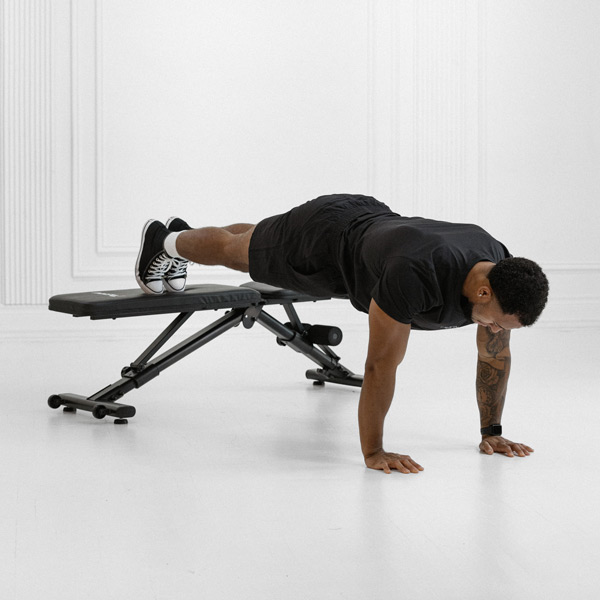 A modified push-up with hands elevated on a bench that targets the chest, shoulders, and triceps to build upper body strength; ideal for beginners progressing to full push-ups.