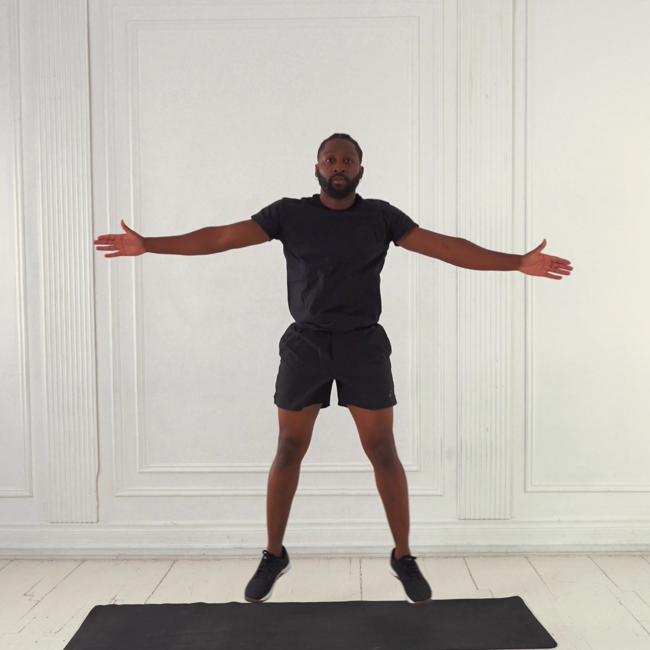 Bodyweight calisthenics exercise that jumps feet out wide while raising arms overhead, engaging full body to elevate heart rate, improve coordination, and build cardiovascular endurance.