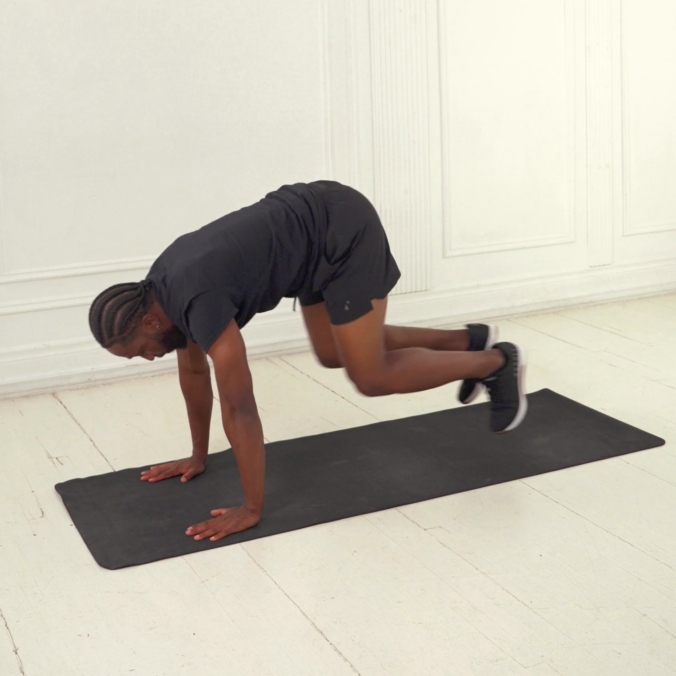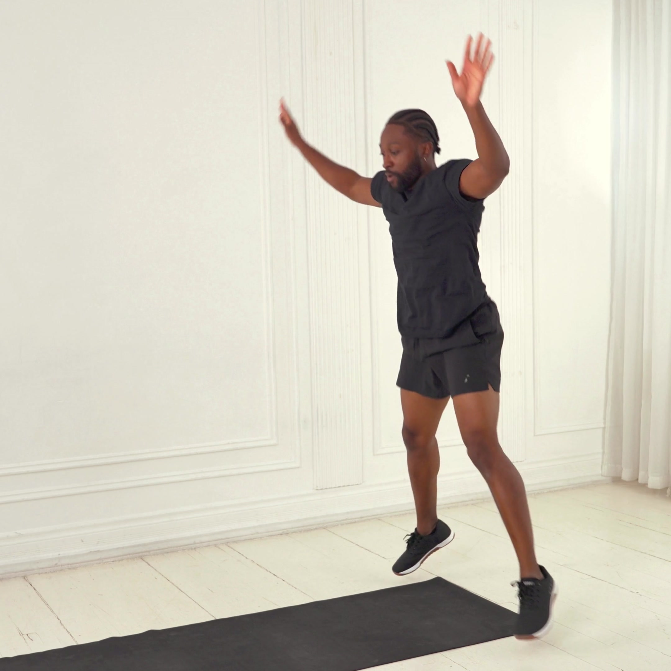 Inhale as you jump out and raise arms; exhale as you jump back and lower arms.