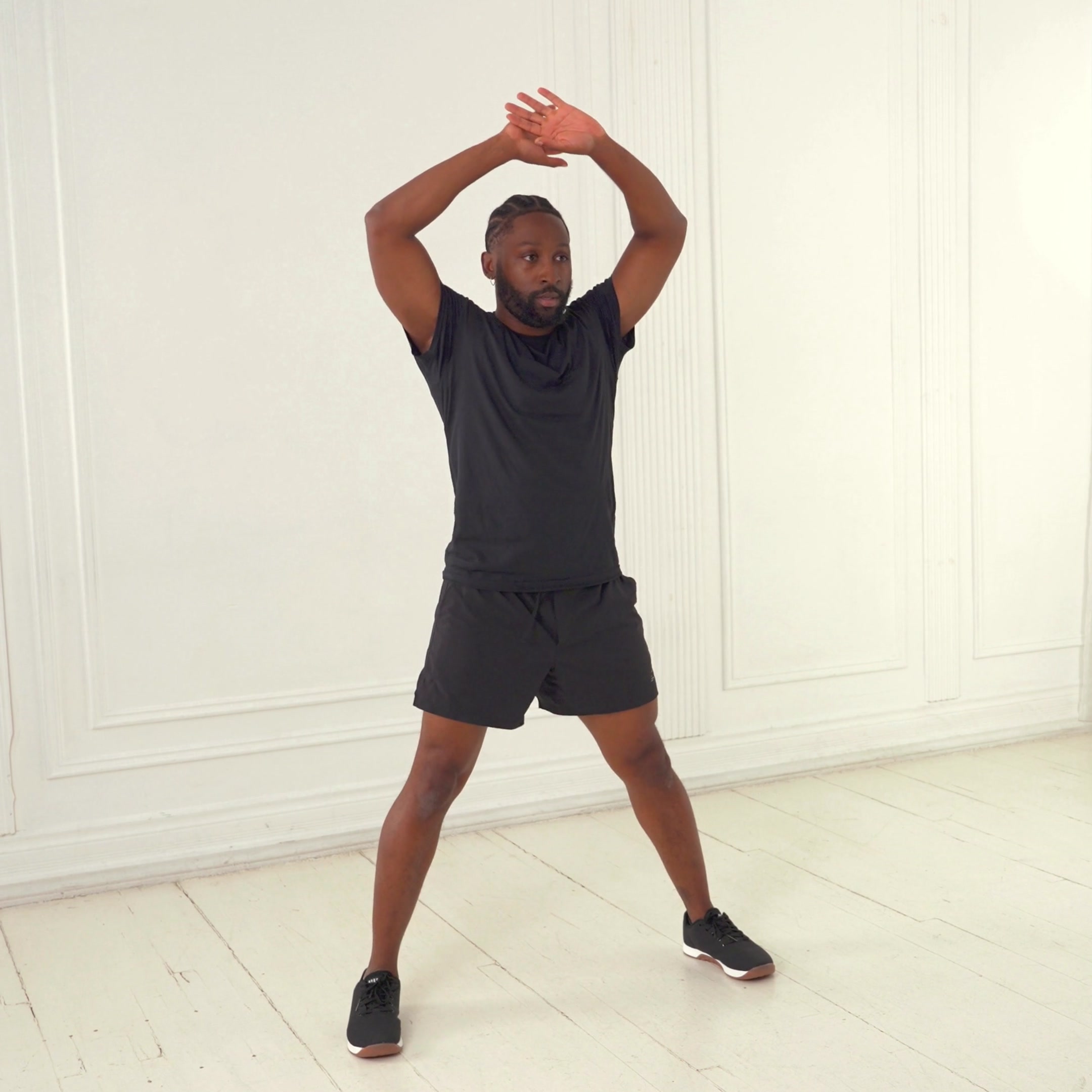 Feet land wider than shoulders with legs straight; arms fully extended overhead.