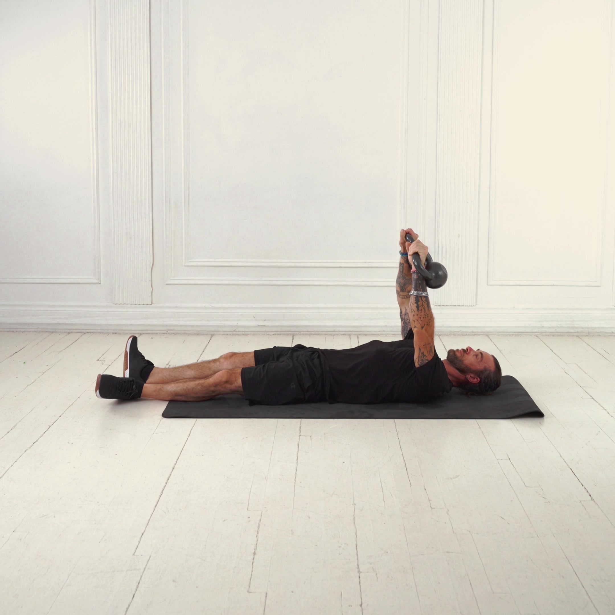 Kettlebell bench press that targets chest, shoulders, and triceps to build upper body strength and stability; the offset load engages core and improves coordination.