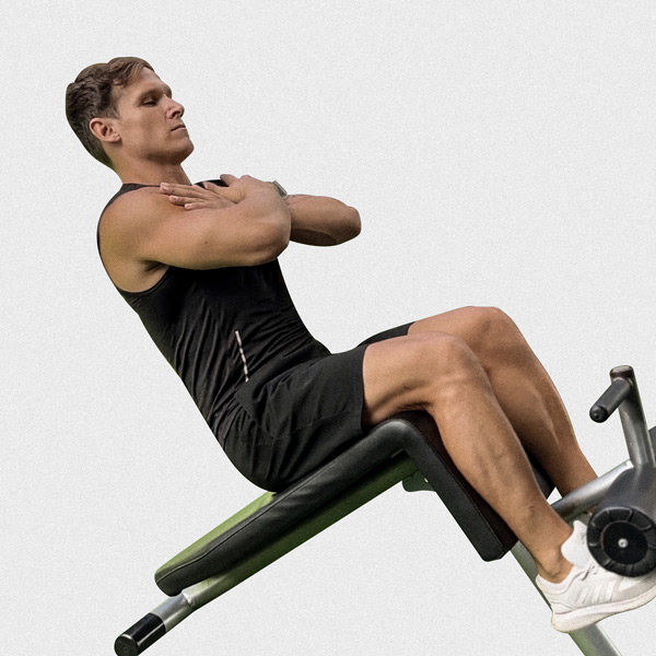 Torso from flat on bench to upright; twist until kettlebell nears opposite knee without hips moving.