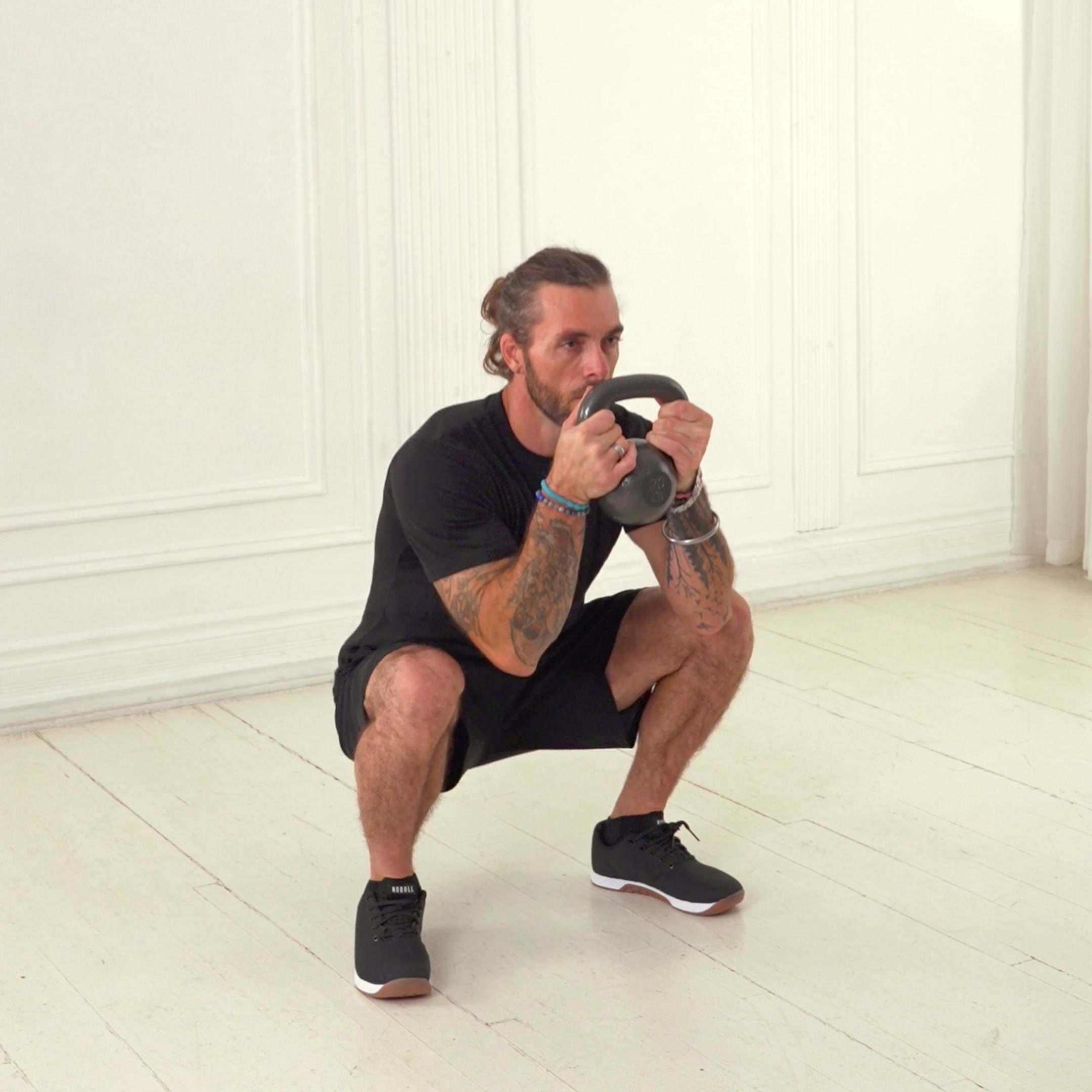 Stand tall with feet shoulder-width apart, holding a kettlebell vertically against your chest with both hands (goblet position). Maintain a slight bend in your knees and brace your core.