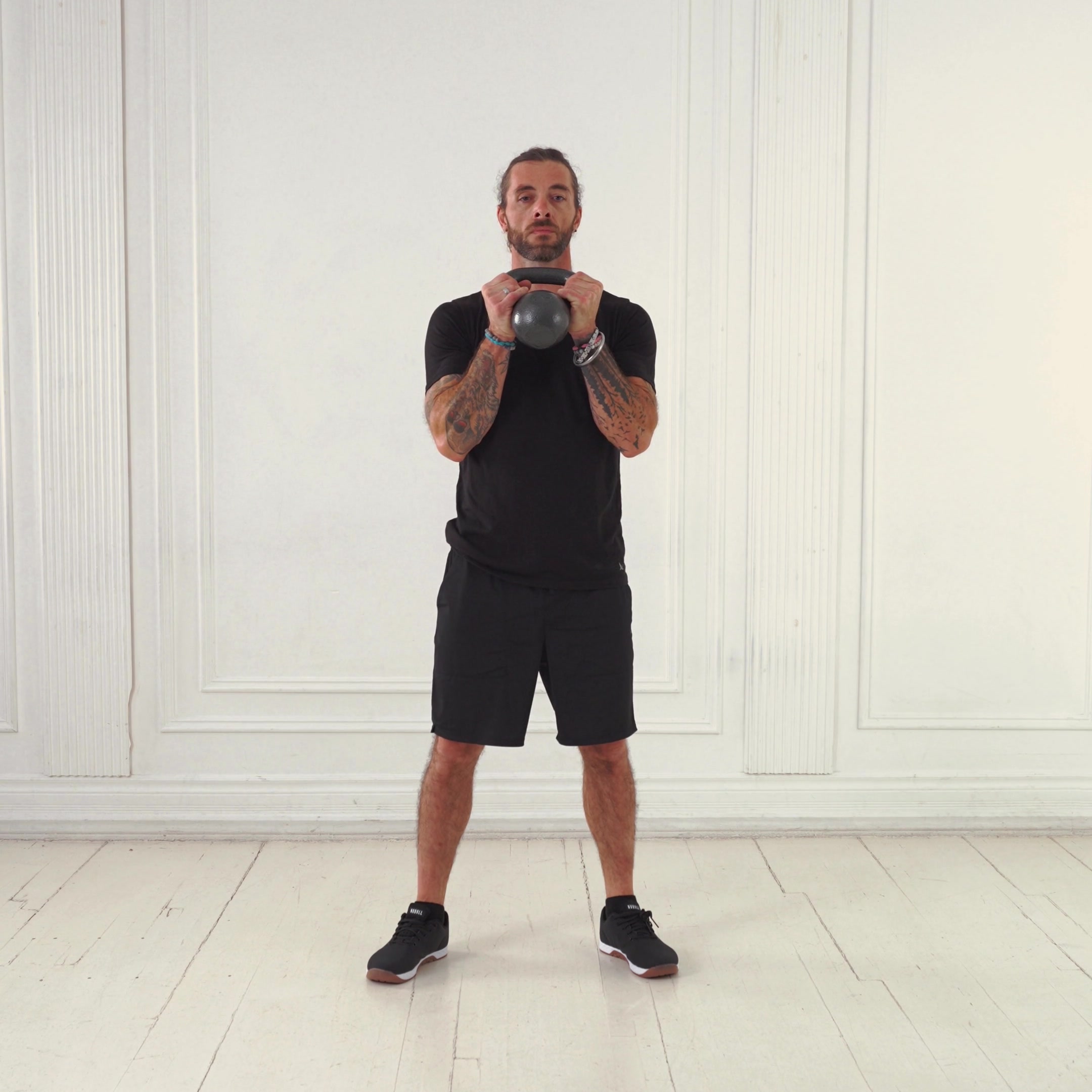 Stand with feet shoulder-width apart, toes slightly outward. Hold kettlebell close to chest with both hands, elbows tucked down, core engaged, and chest tall.