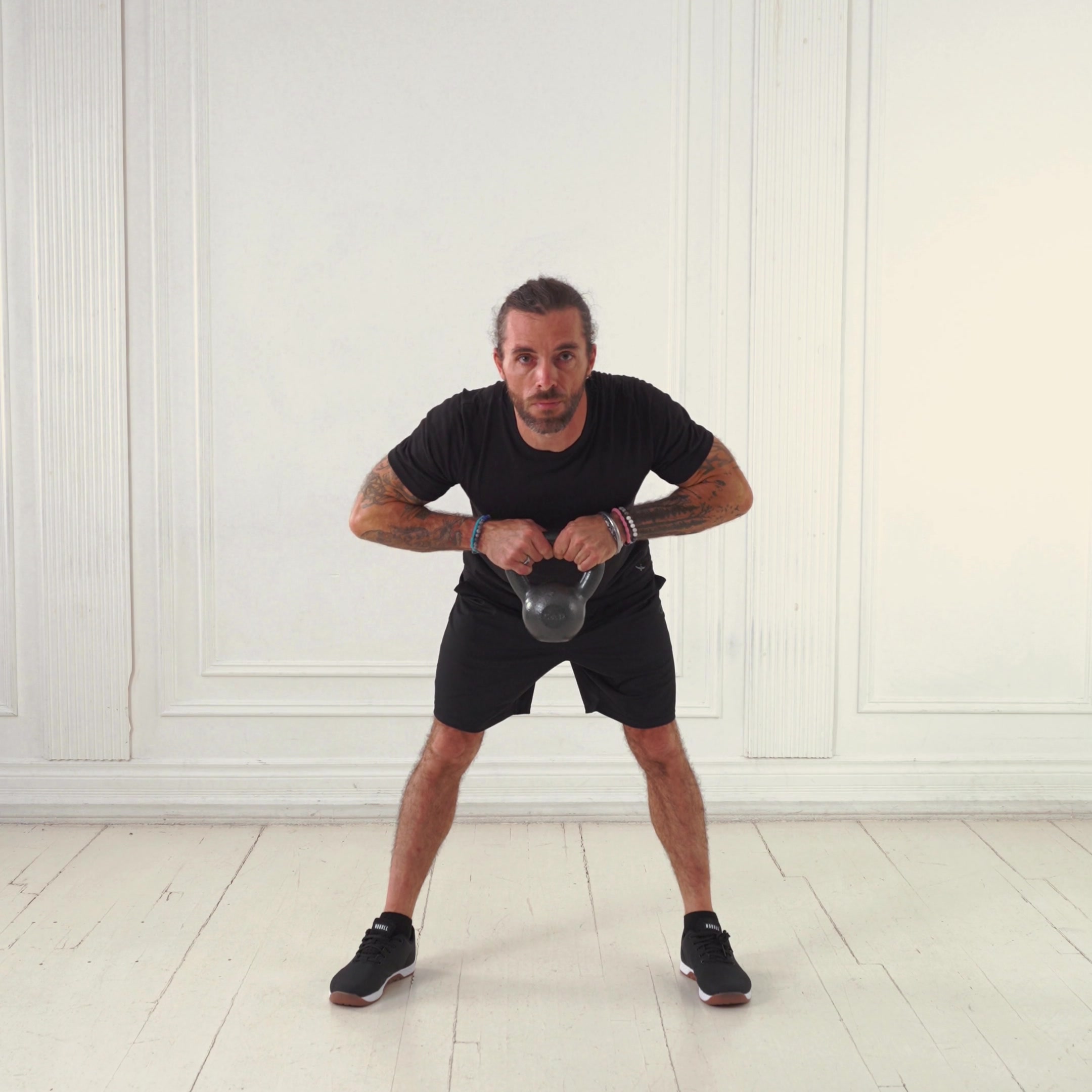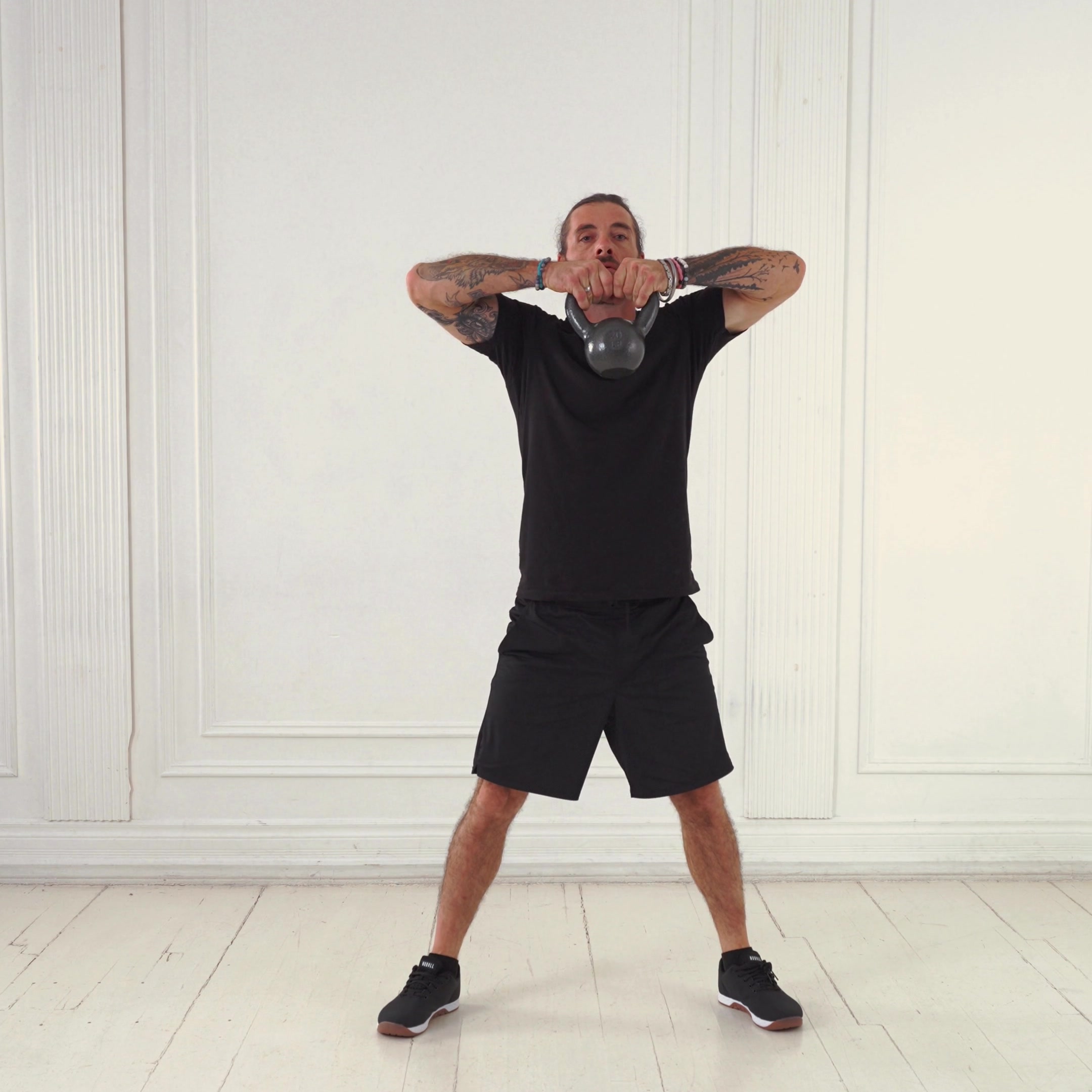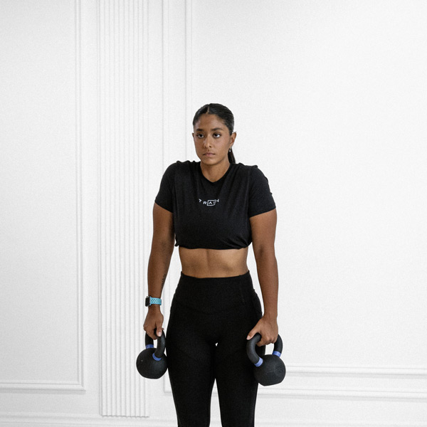 Stand with feet shoulder-width apart, knees slightly bent, core engaged. Grasp kettlebell handle with both hands overhand, arms extended, weight hanging in front of thighs.