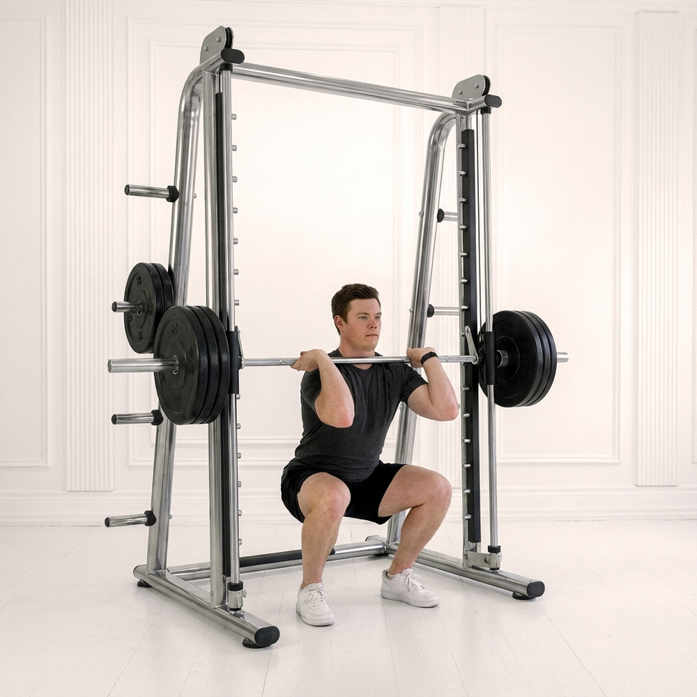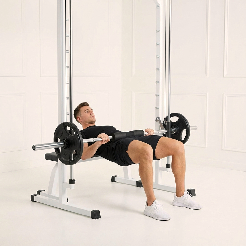 Adjust machine height for full range. Secure padded belt around hips and load weight plates on sleeves. Step onto platform with feet shoulder-width.