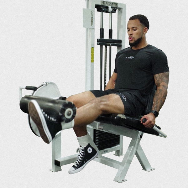 Sit on the machine with back and head against the pad, feet flat on the platform hip-width apart at 90-degree knee angle, grasp side handles.