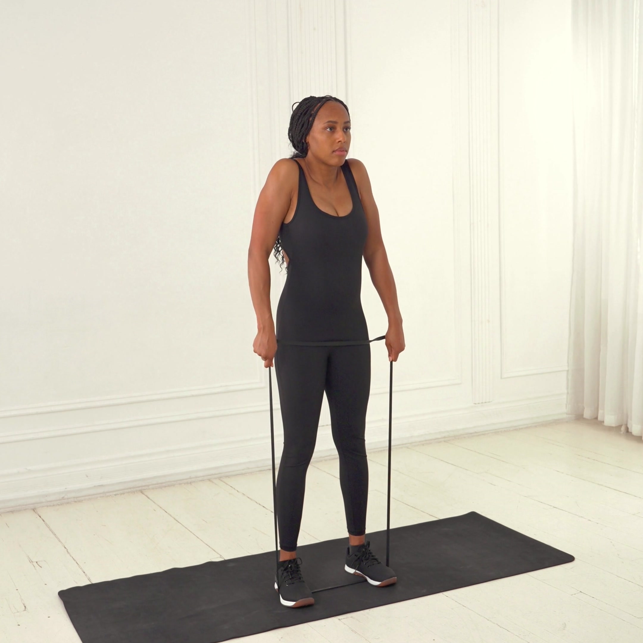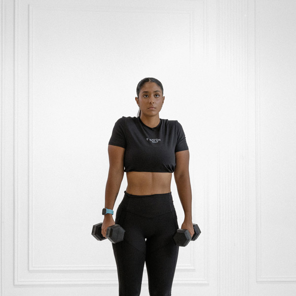 Inhale as you lower the weight, exhale as you shrug up while bracing your core.