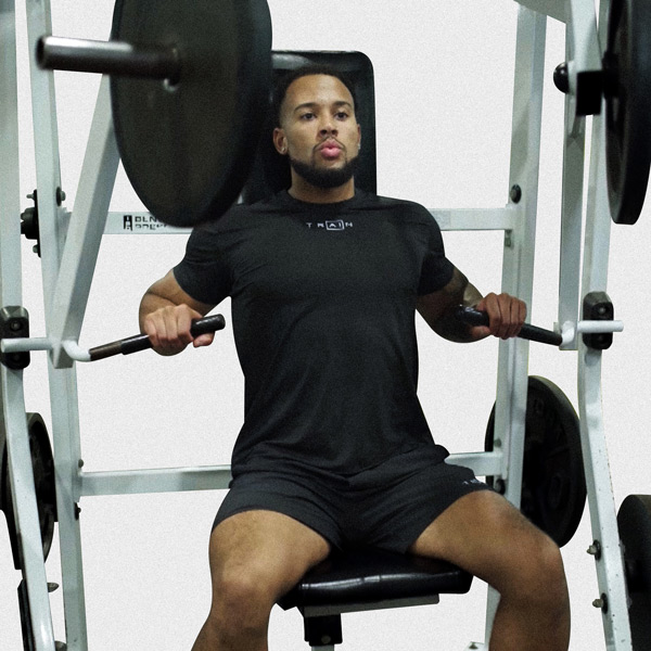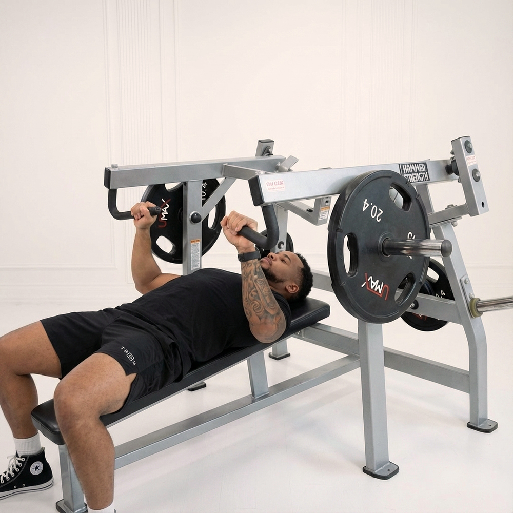 Machine supine bench press that targets chest, front shoulders, and triceps to build upper body pressing strength and muscle size; a stable, guided alternative to free-weight bench presses.