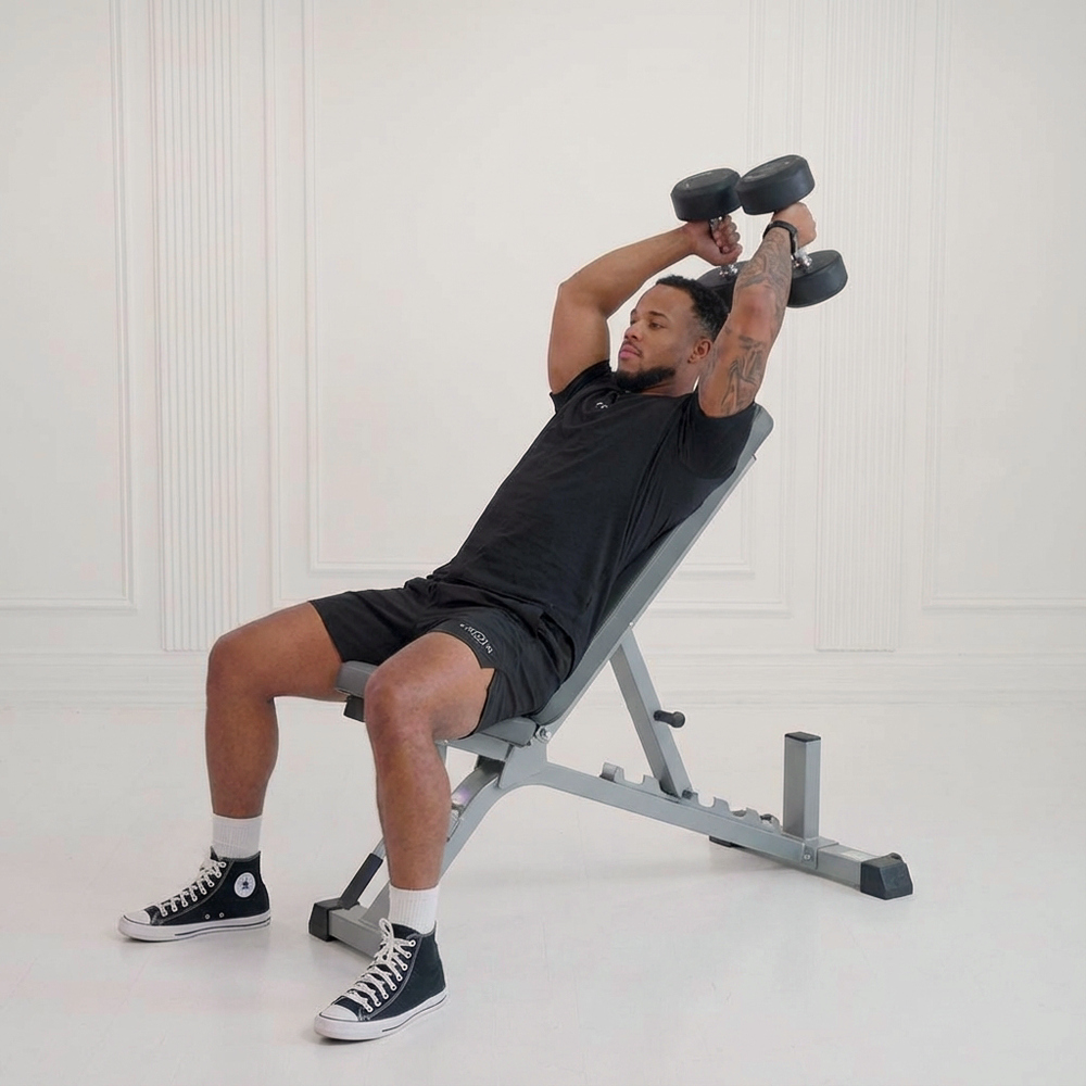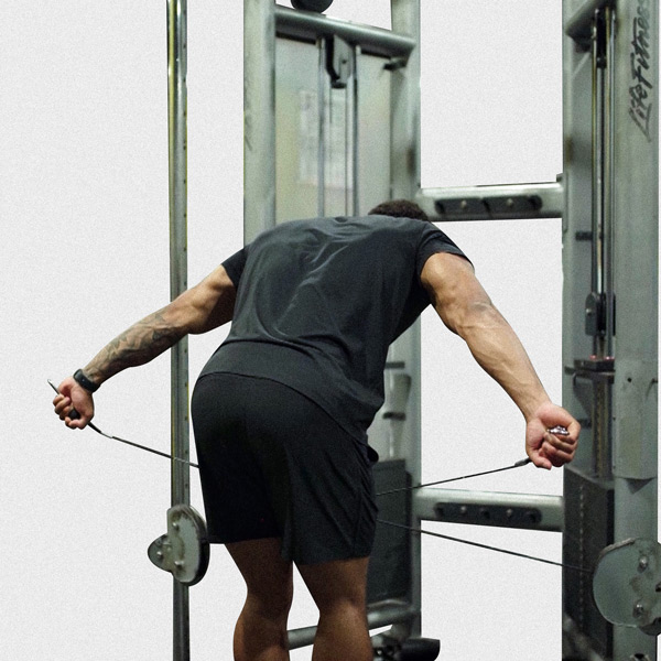 Adjust the seat so upper arms align with the machine's pivot and rest flat on pads. Grip handles with neutral grip, elbows tucked, feet planted firmly.