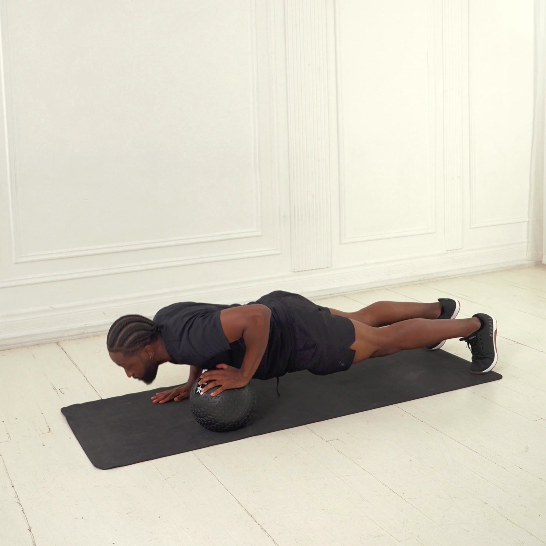 Place a medicine ball on the floor and assume a high plank position with both hands gripping the ball sides, body straight from head to heels, core engaged.