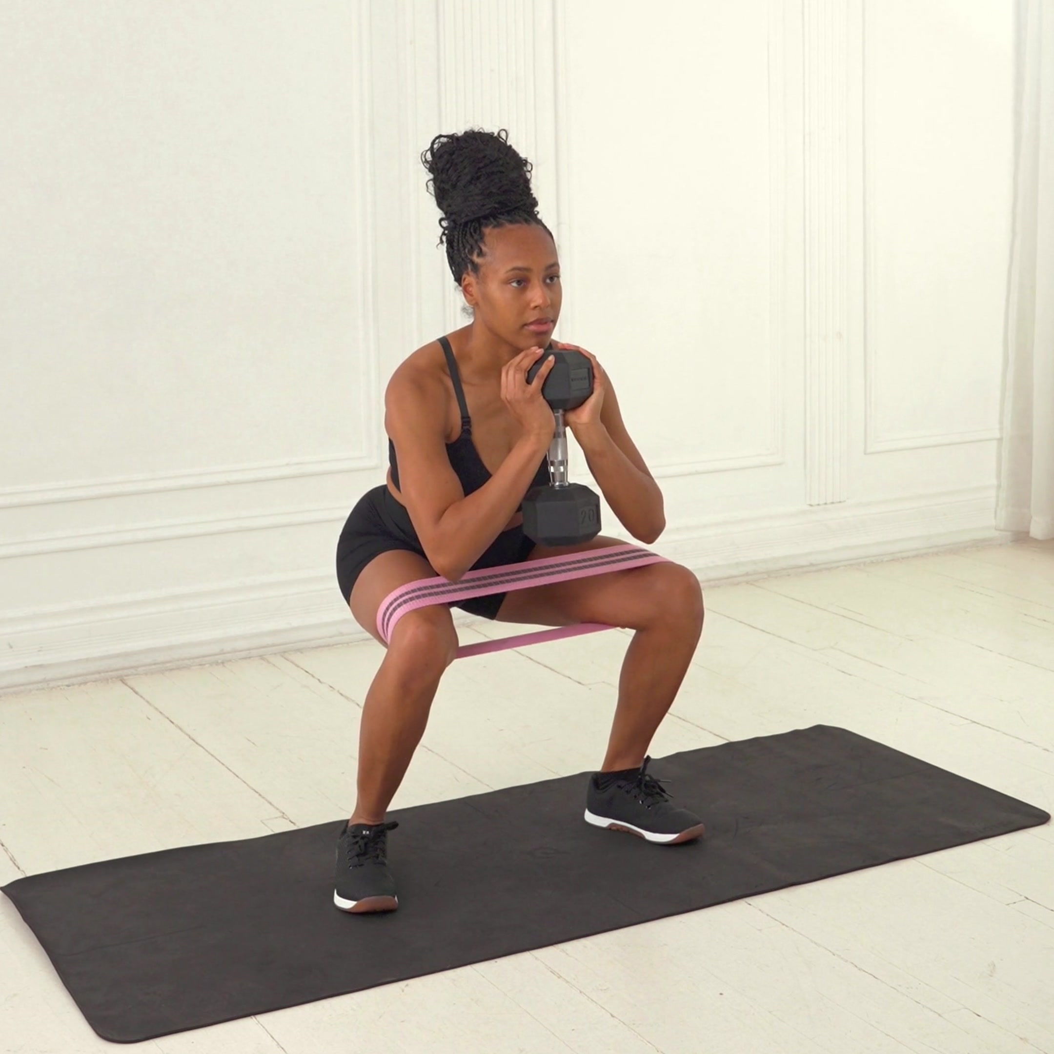 Stand with feet hip-width apart and place mini loop band just above knees. Engage core, keep chest up, and shoulders back.