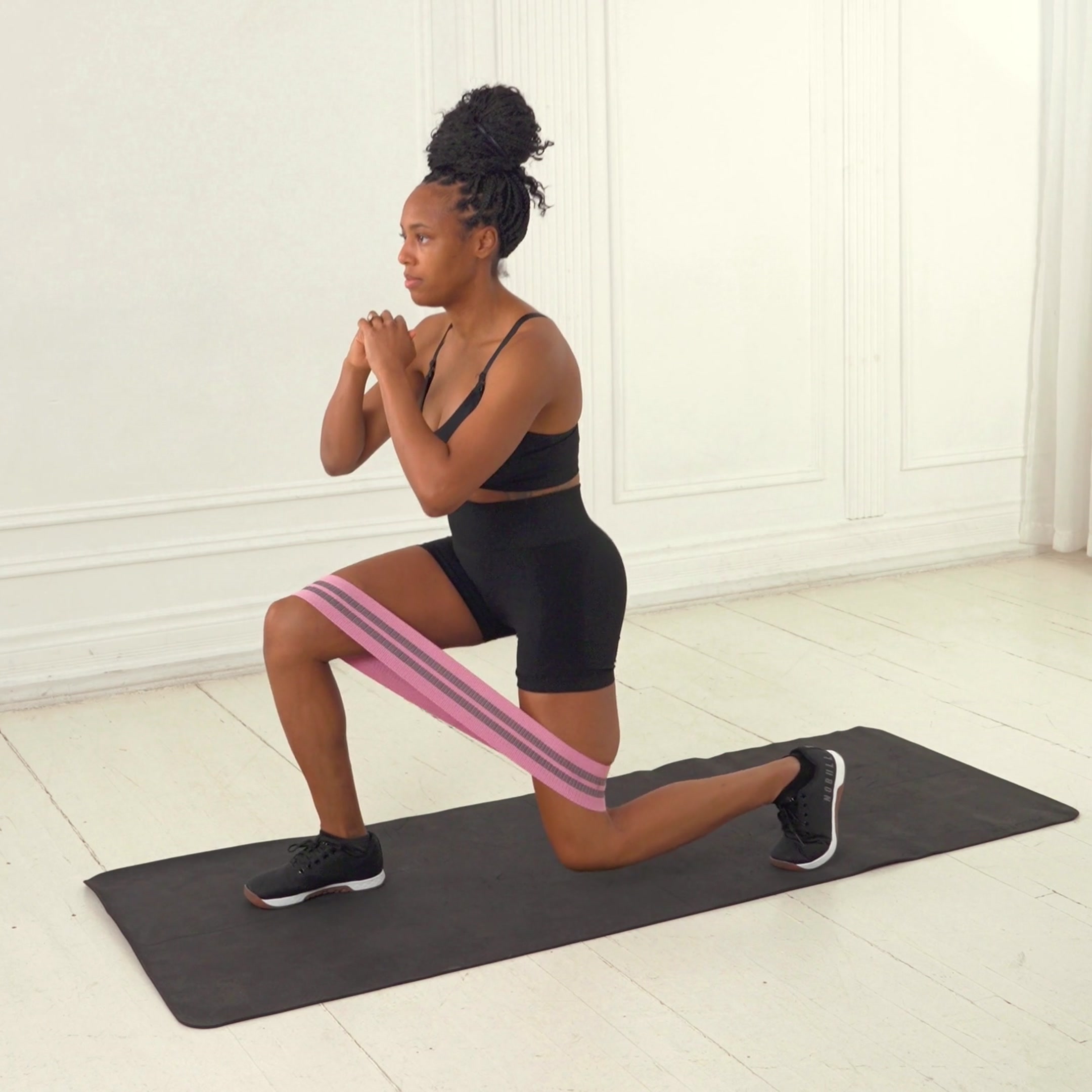 A lunge variation with a mini loop band around the thighs that targets glutes, quadriceps, and hamstrings to build lower body strength and hip stability; commonly used for unilateral training and balance.