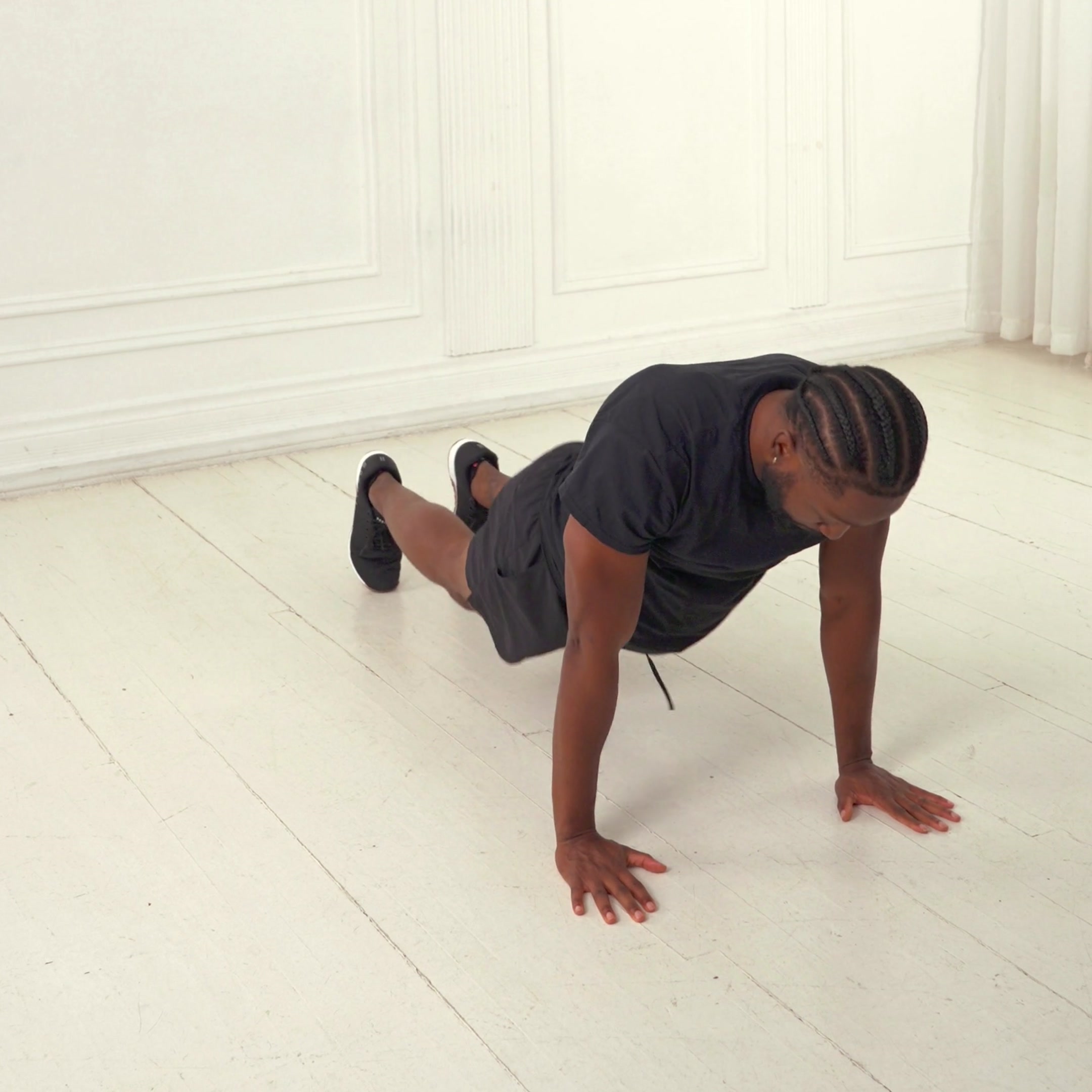 Start in a high plank position with hands under shoulders, body straight from head to heels, core engaged and glutes squeezed.