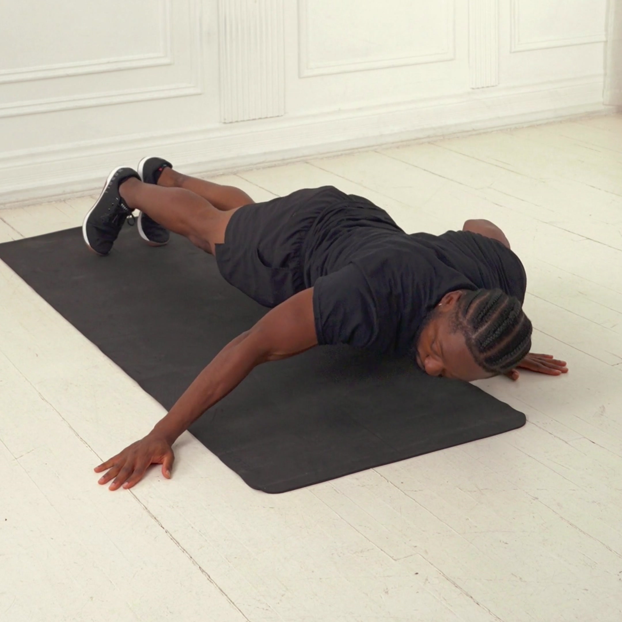 Lower until chest is just above floor or elbows at 90 degrees; extend arms fully without locking elbows.