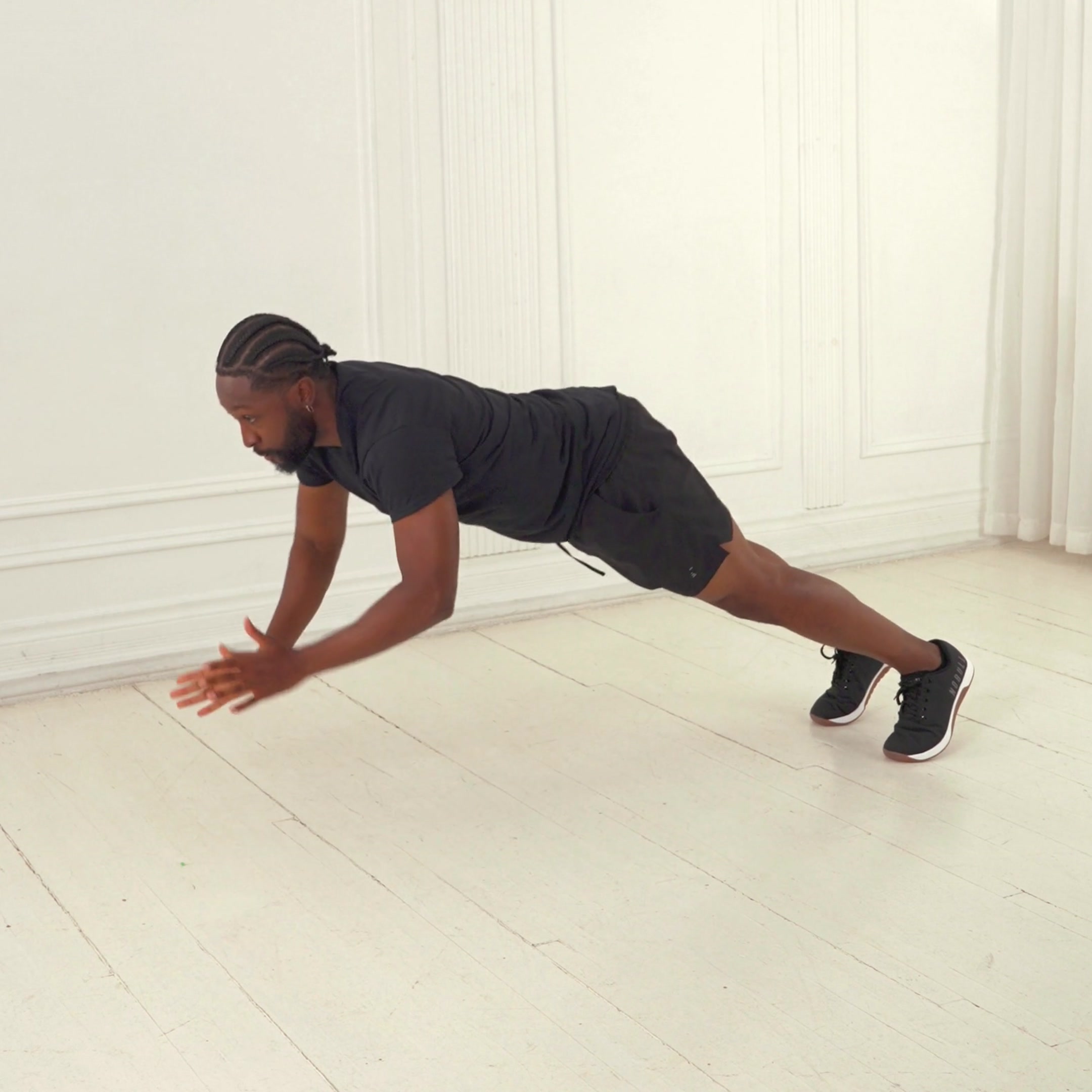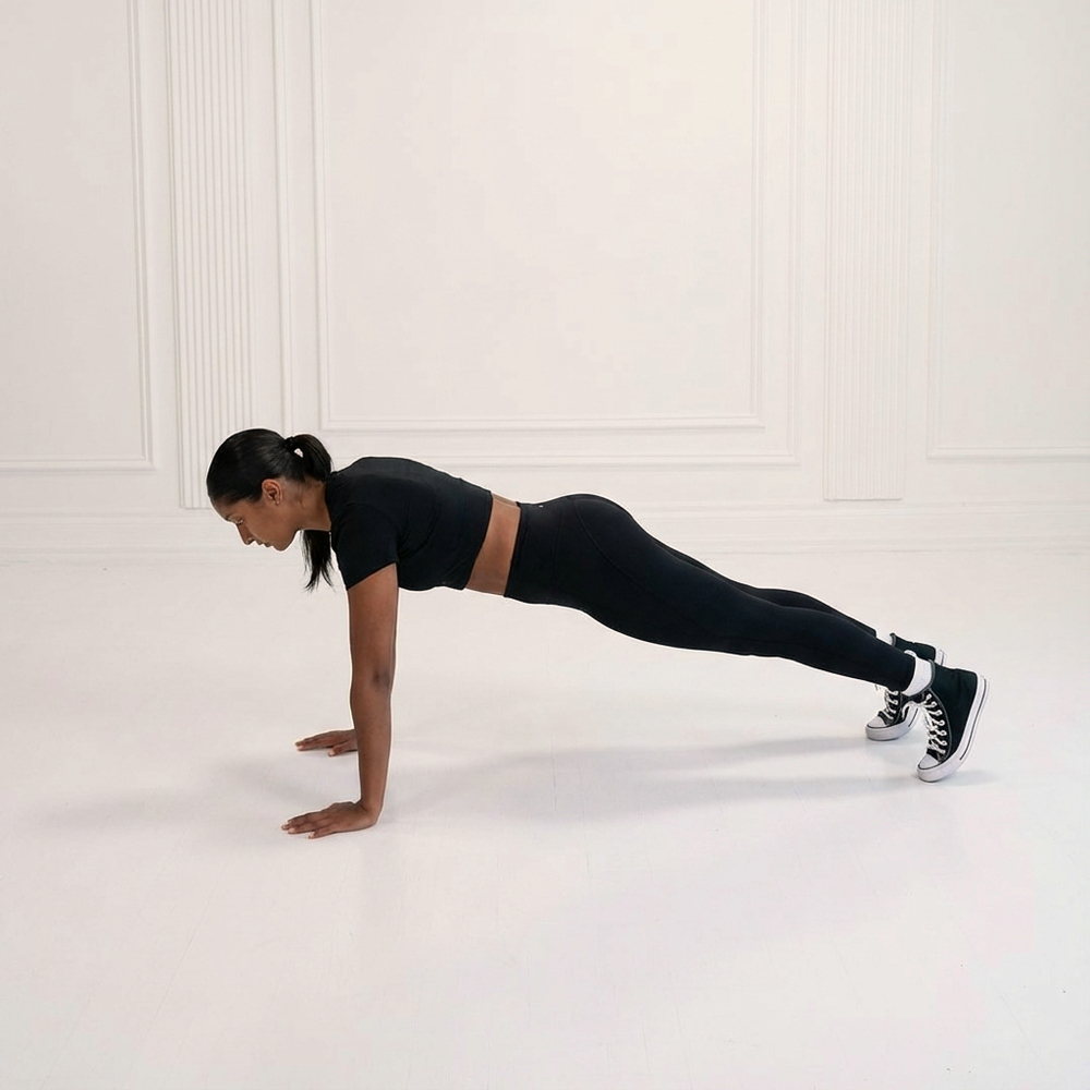 Position hands shoulder-width apart on the floor, directly under shoulders, with body in a straight high plank from head to heels, feet hip-width and core engaged.