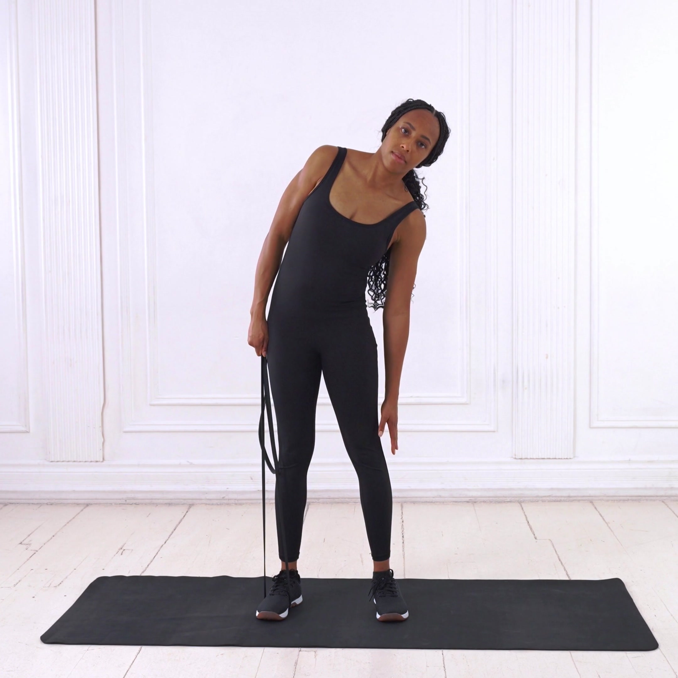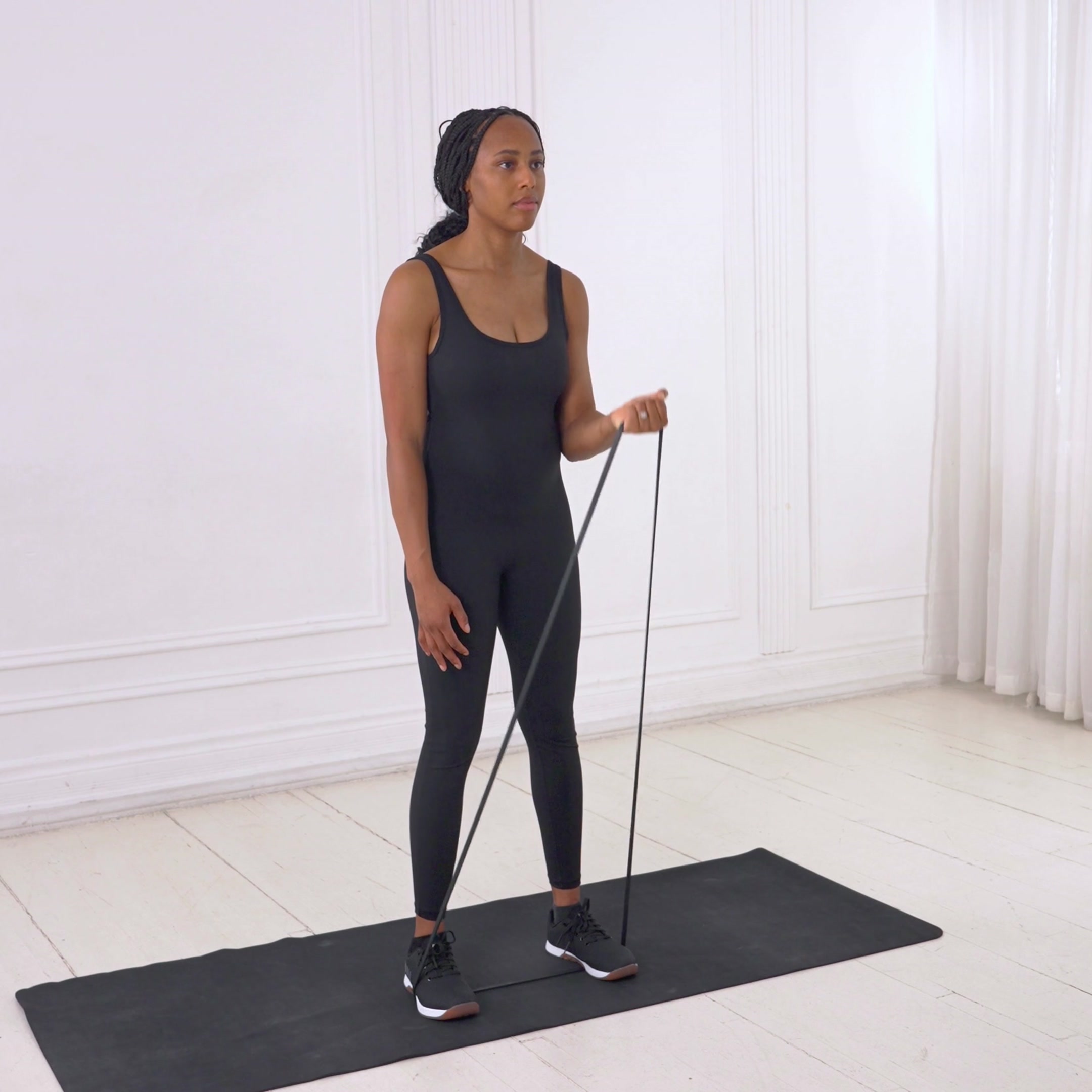 Stand with feet shoulder-width apart on the middle of a resistance band. Grip one end in each hand with palms facing forward and arms fully extended at your sides.