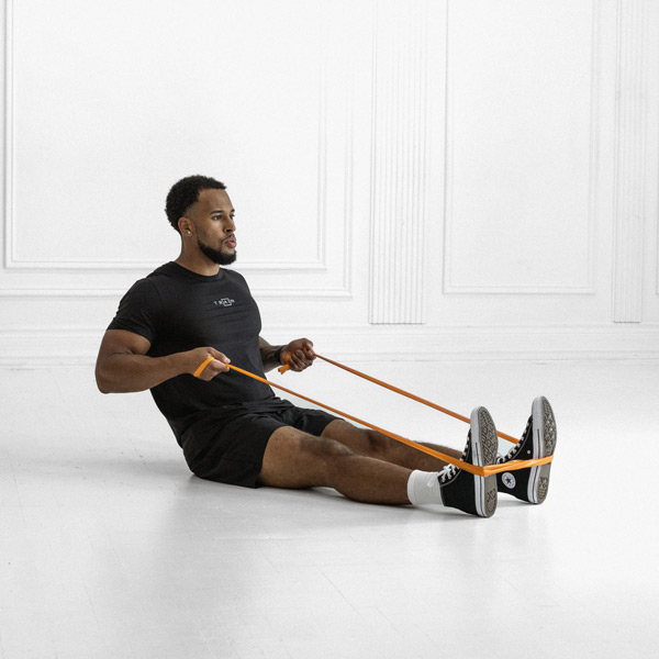 Inhale during the lowering phase and exhale as you curl the band upward while bracing your core.