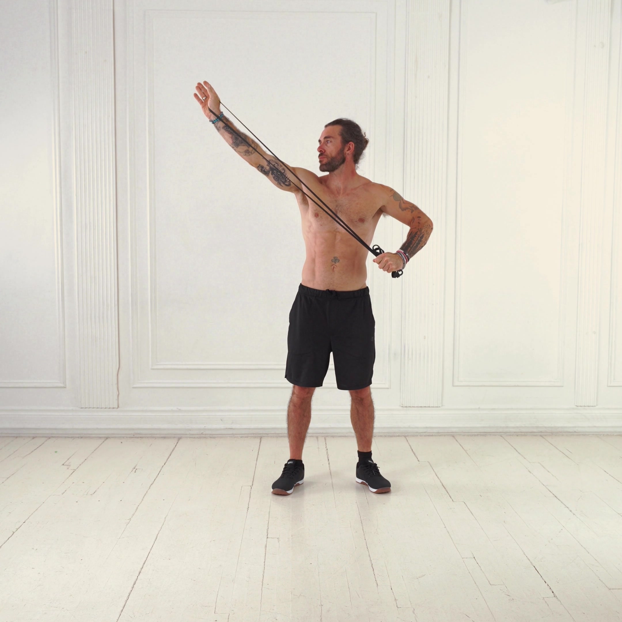 Inhale during the return phase and exhale as you pull the band back, keeping your core braced throughout.