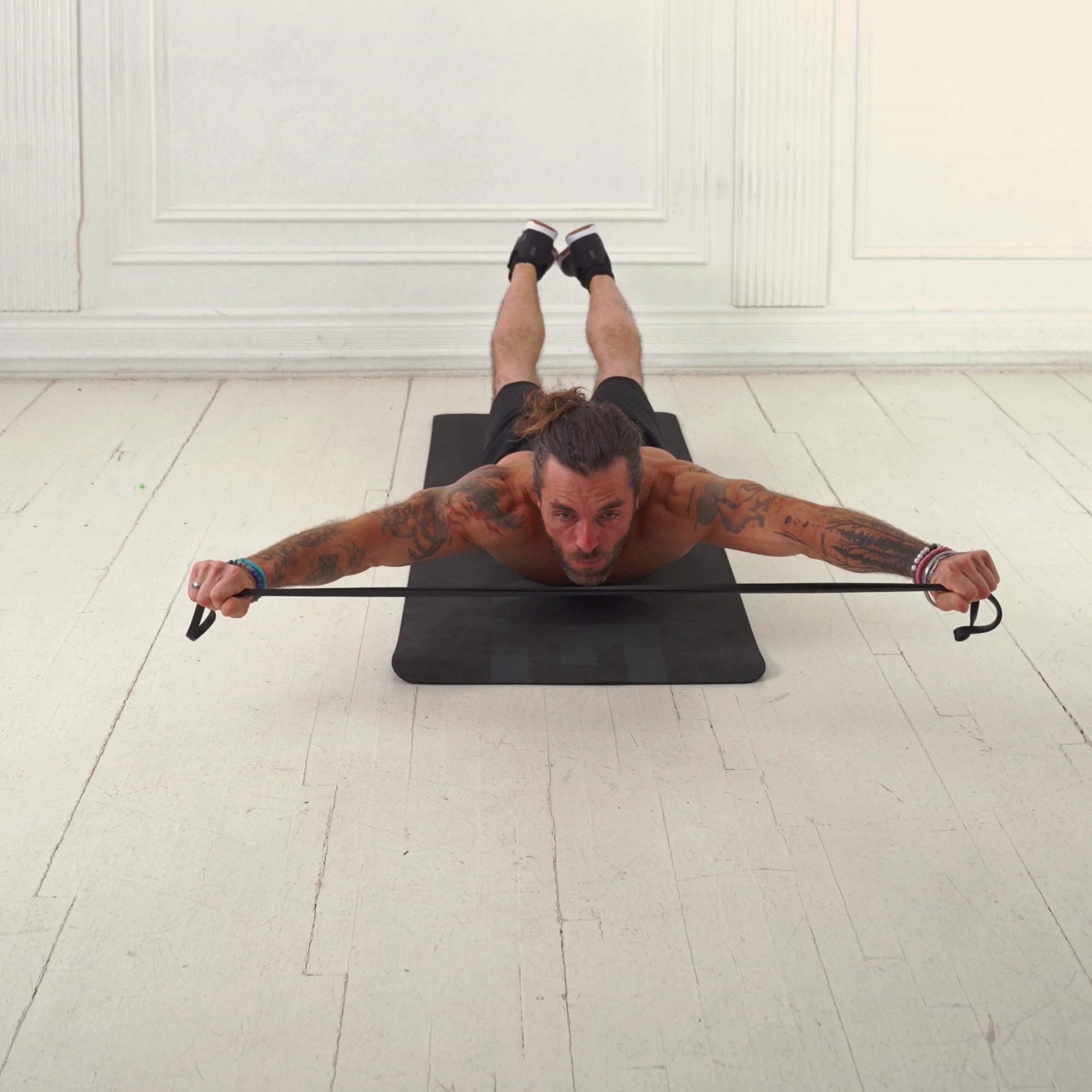 A band-based shoulder elevation that targets the upper trapezius to build upper back strength and improve posture; suitable for home workouts and rehabilitation.