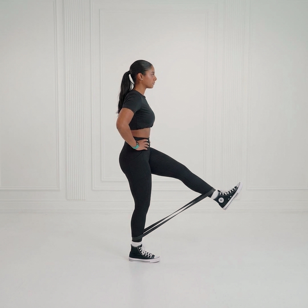 A unilateral lower body press using a resistance band that targets quadriceps, glutes, and hamstrings to build strength, correct imbalances, and improve stability; suitable for home workouts or rehabilitation.
