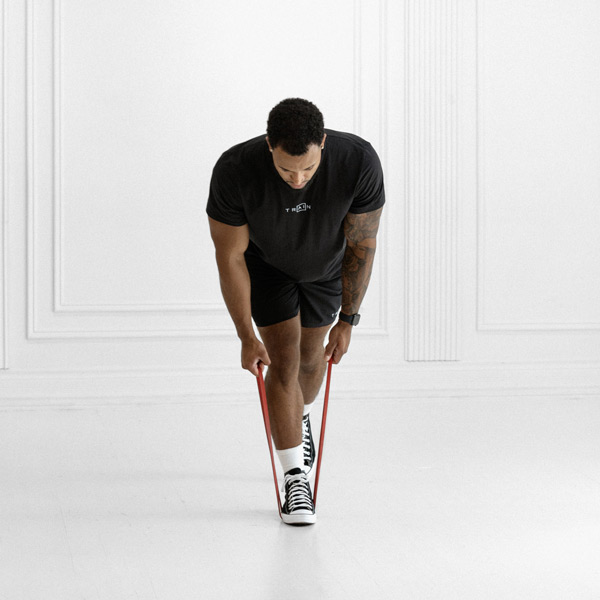 Stand on one foot with band anchored under the midfoot. Hold band end in opposite hand with slight tension, non-working leg extended back for balance.