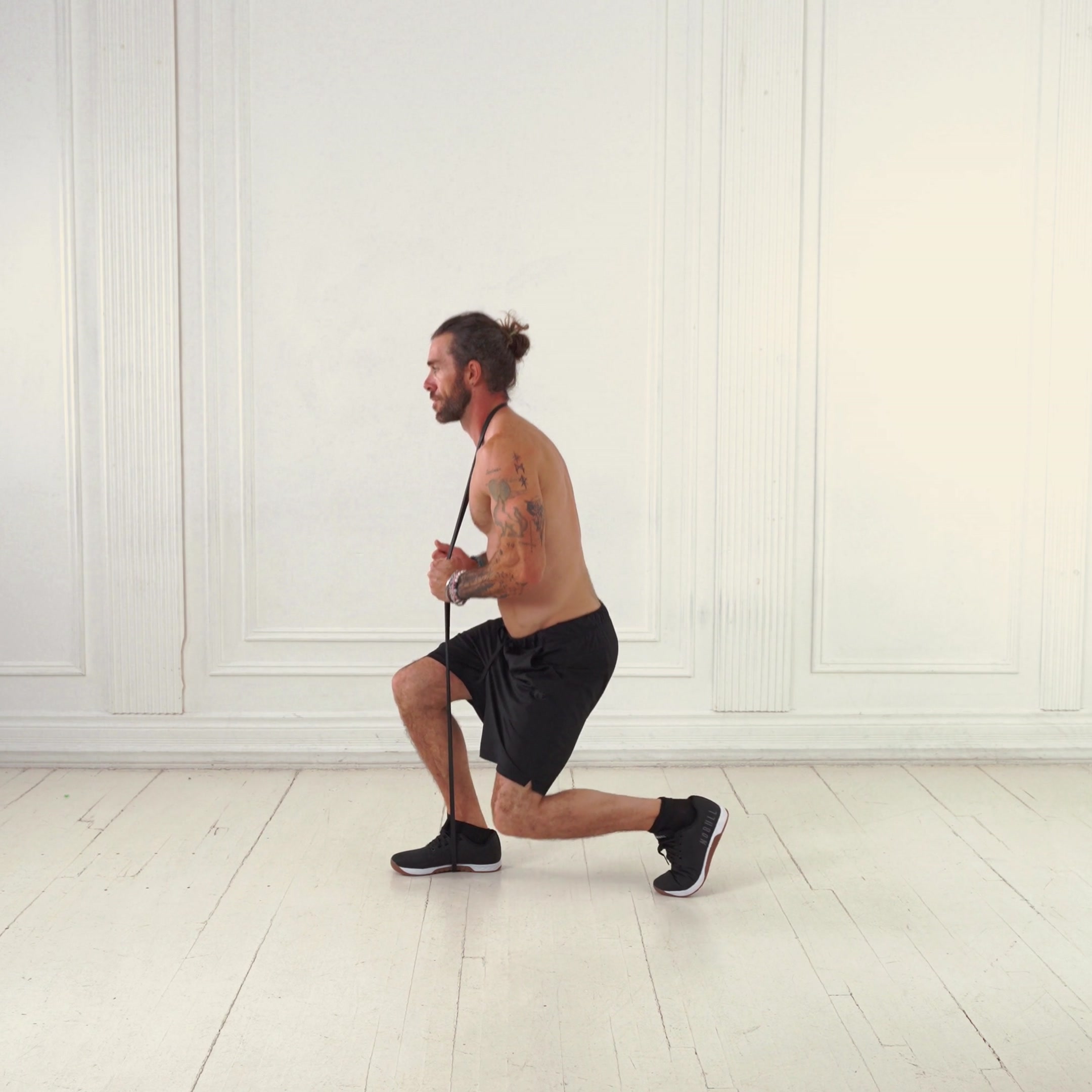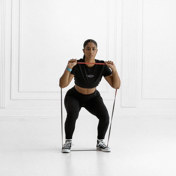 A squat variation using resistance bands placed under feet and held at shoulders that targets quads and glutes to build lower body strength and endurance; joint-friendly and scalable for all levels.