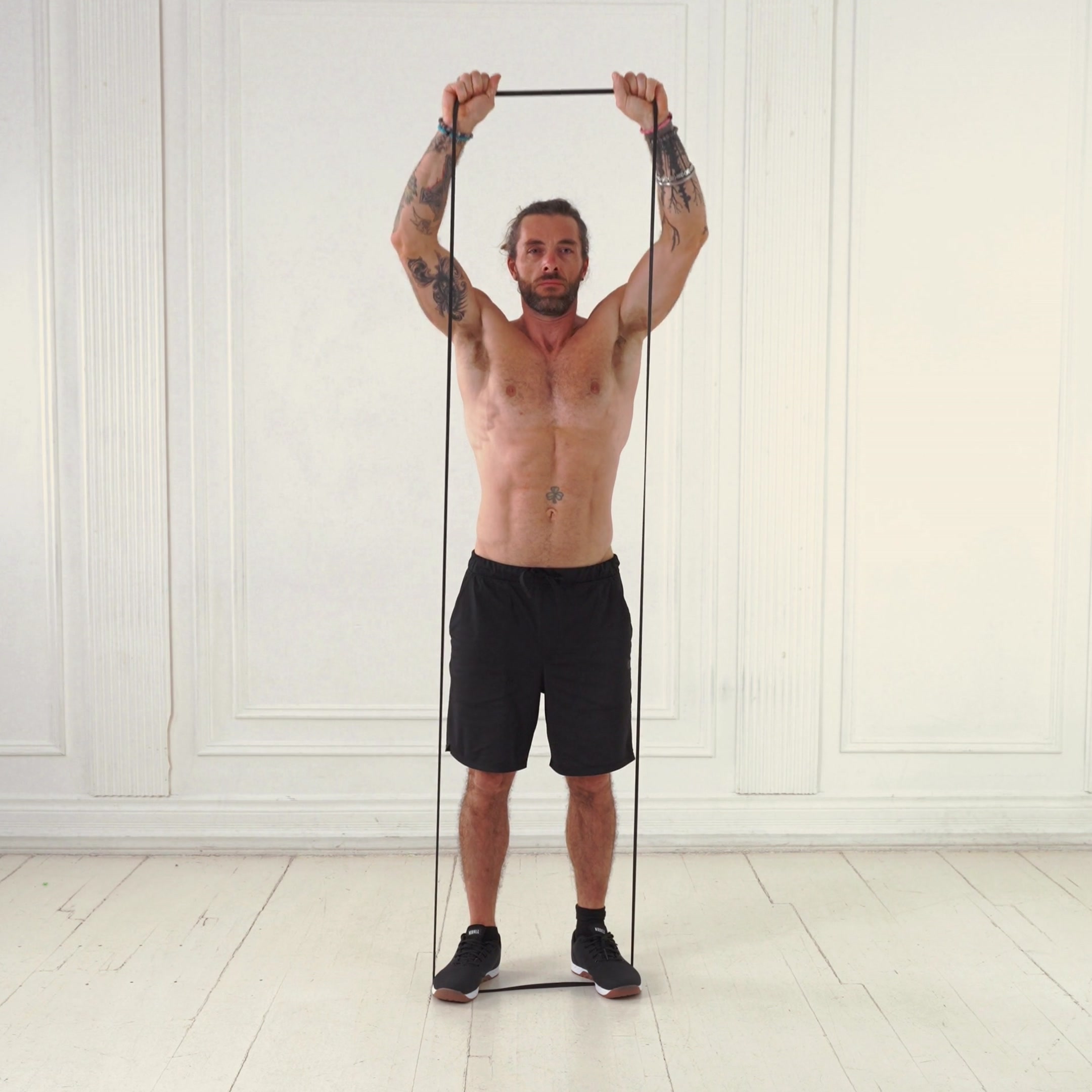 Step onto the center of a long loop resistance band with feet shoulder-width apart, toes slightly out. Hold the band ends at shoulder height with palms forward, keeping it taut.