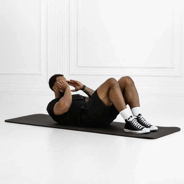 Lie flat on your back on a mat with arms by your sides, palms down. Bend knees to 90 degrees, lifting thighs perpendicular to floor and shins parallel.