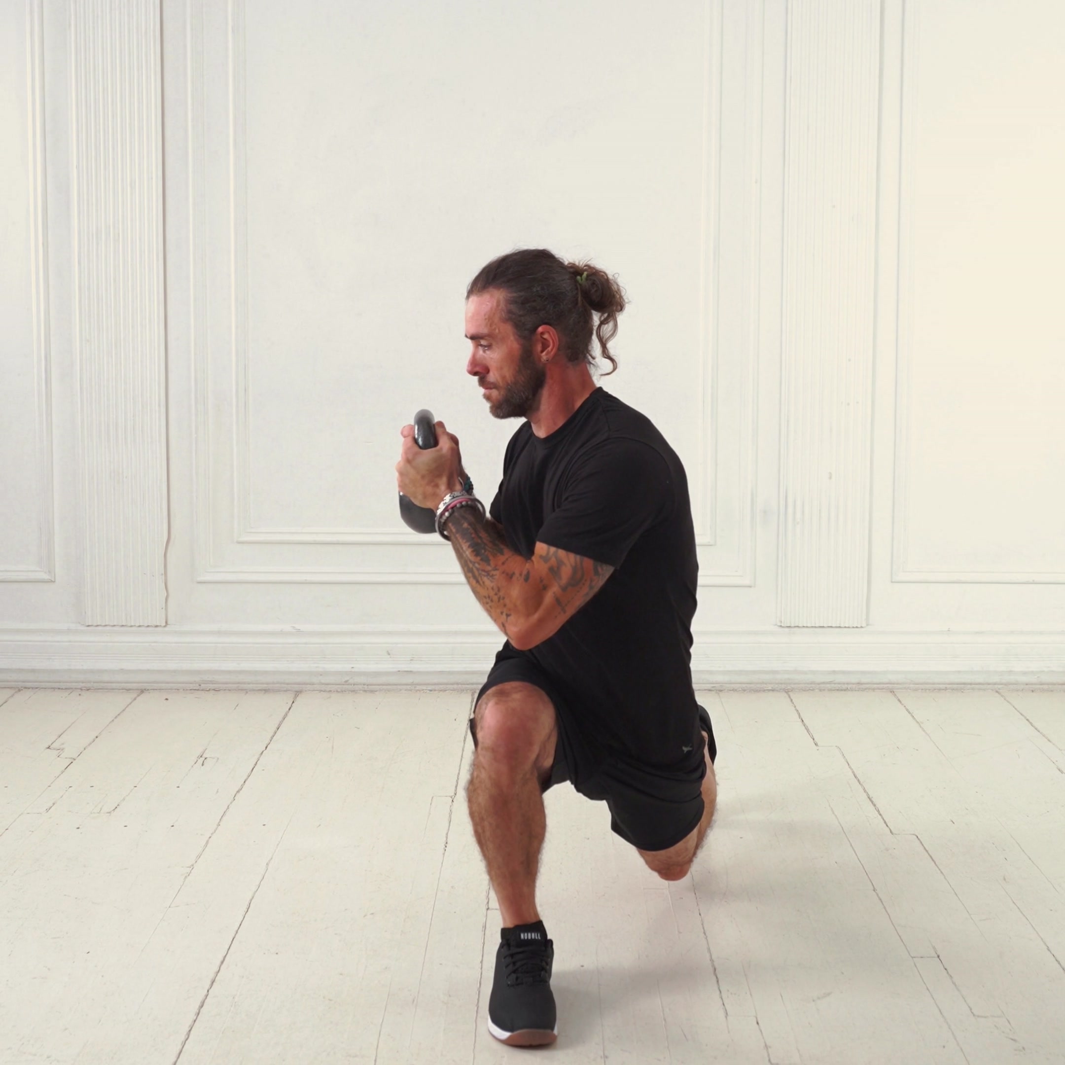 Lower until the back knee lightly taps the floor or is just above it. Rotate the torso as far as comfortable without shifting the hips.