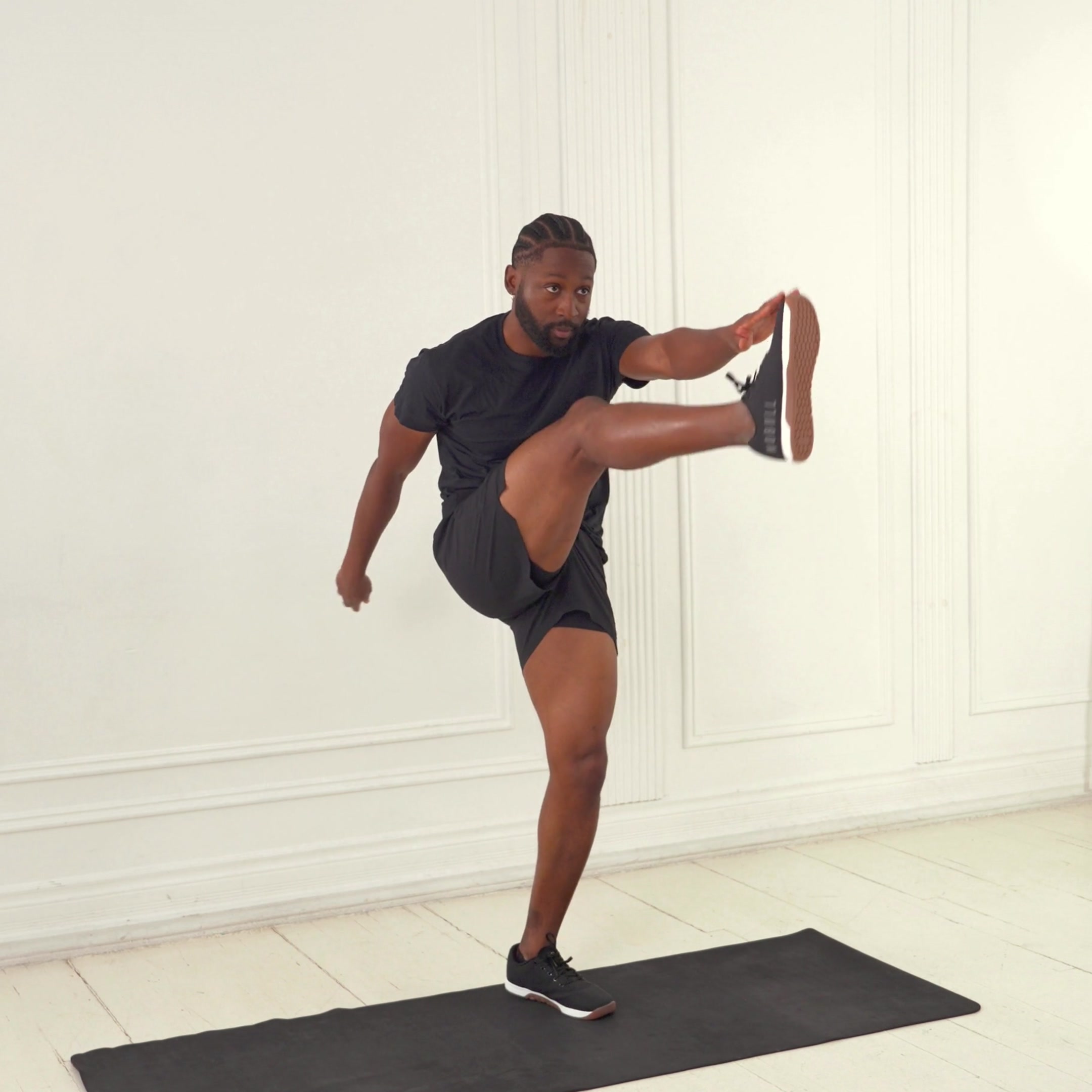 A dynamic bodyweight drill that activates hamstrings and glutes while stretching quads and calves to warm up the lower body; improves running efficiency and speed as a cardiovascular warm-up.