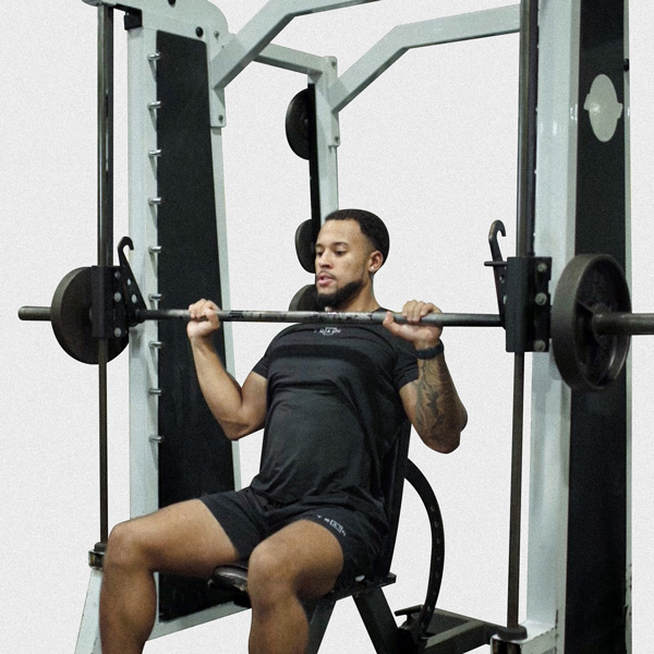 Set up an adjustable bench to 90 degrees inside a power rack with the bar at clavicle height when seated. Grip the bar slightly wider than shoulder-width with an overhand grip.
