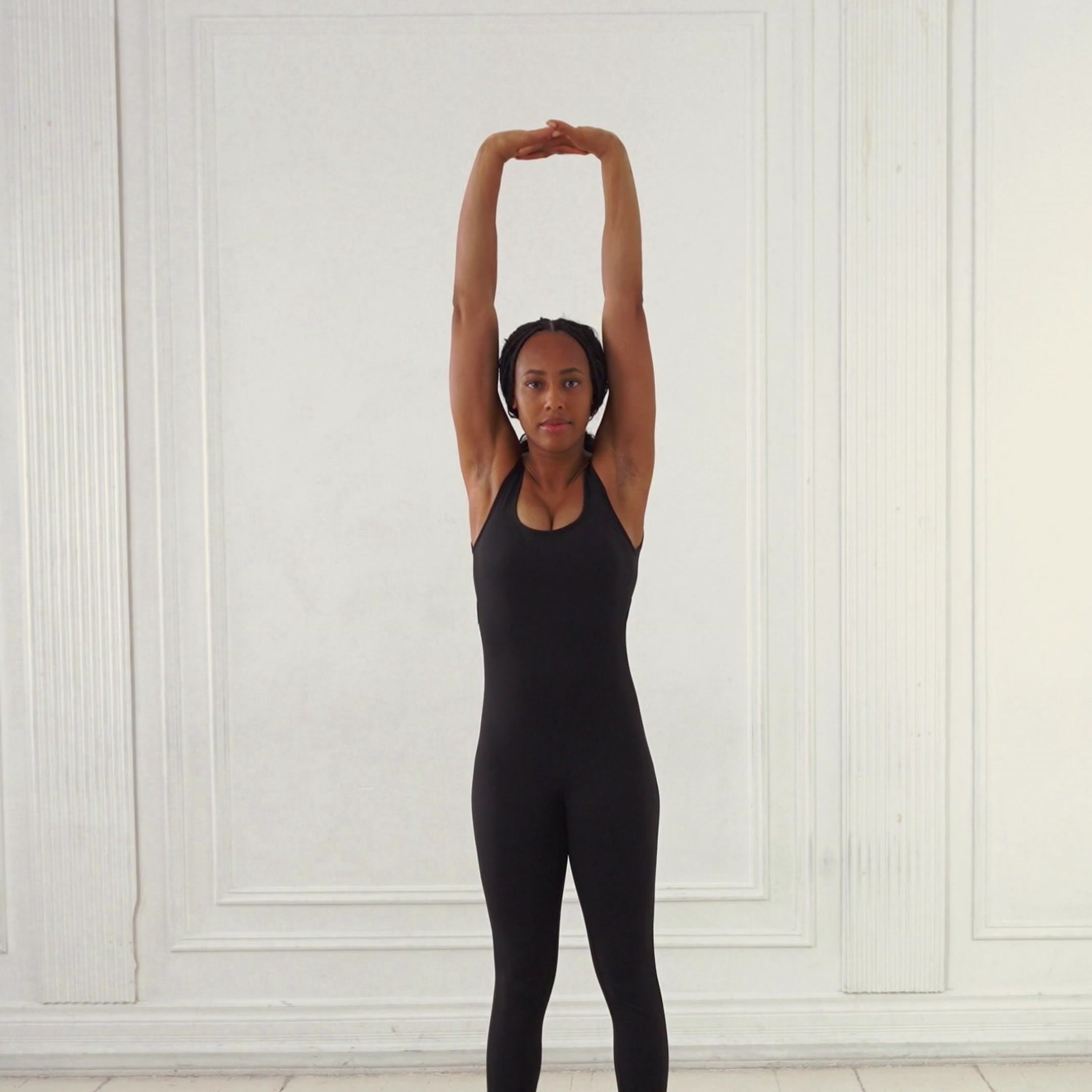 Extend arms until a gentle stretch is felt across the chest and shoulders, without forcing beyond comfort.