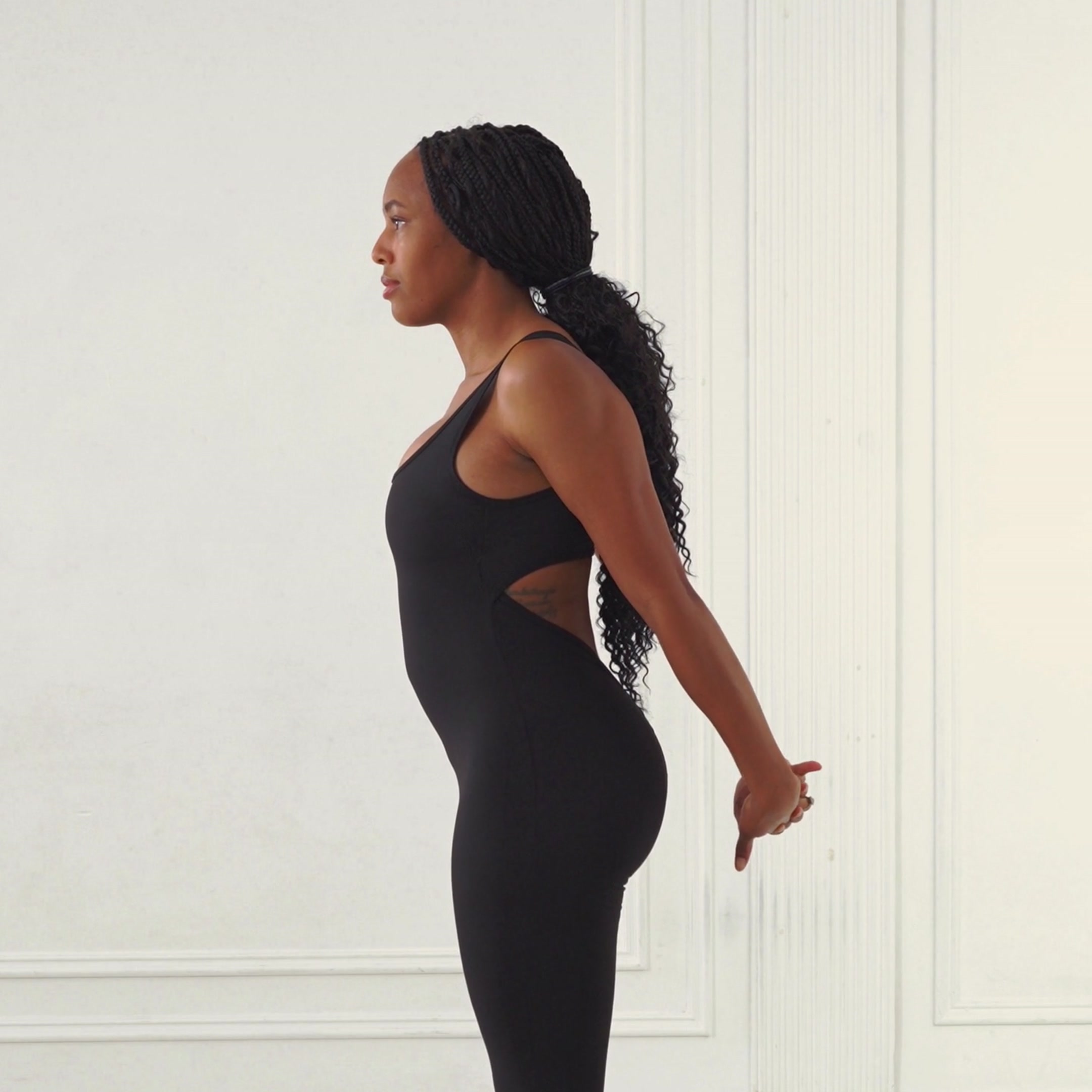 Sit on the edge of a sturdy chair with feet flat on the floor hip-width apart. Reach hands back to grasp the seat corners or clasp behind your back.