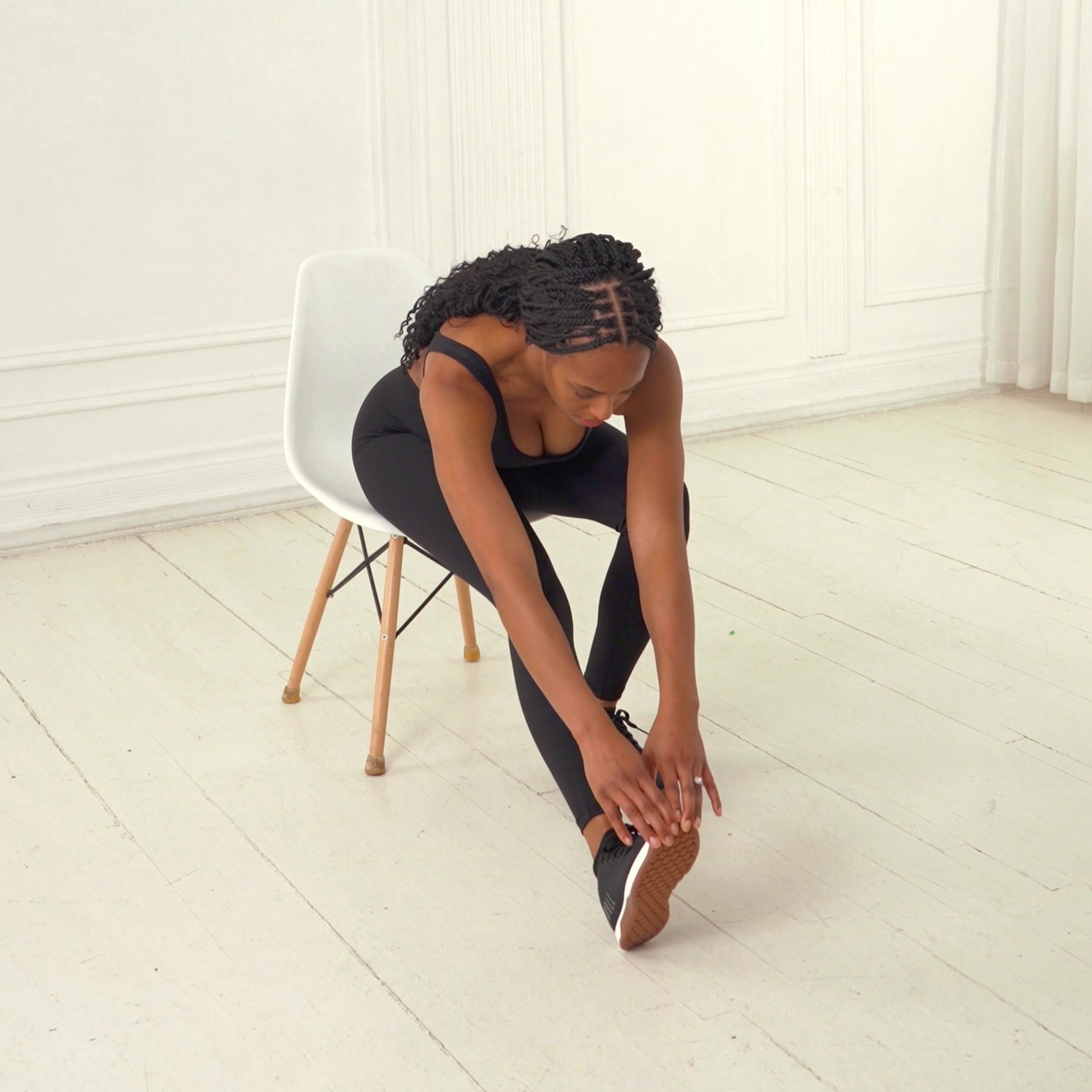 Sit on the edge of a sturdy chair with feet flat on the floor hip-width apart, back straight.