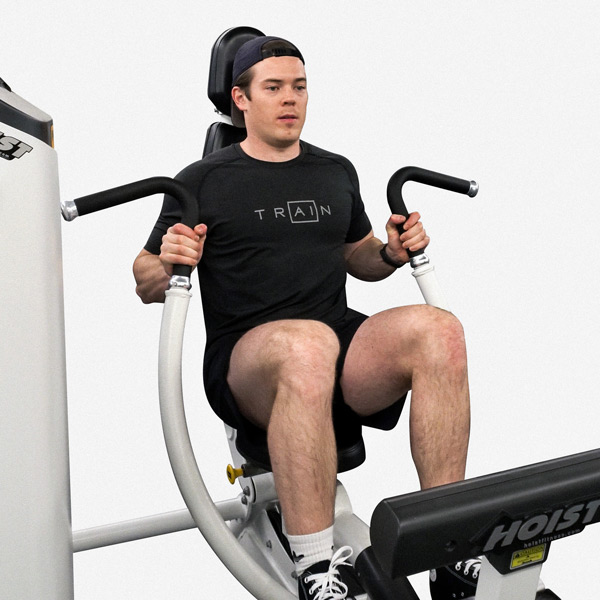 Adjust seat so handles align with shoulders, elbows at 90 degrees. Sit with back against pad, feet flat, grip handles neutrally with palms facing each other.