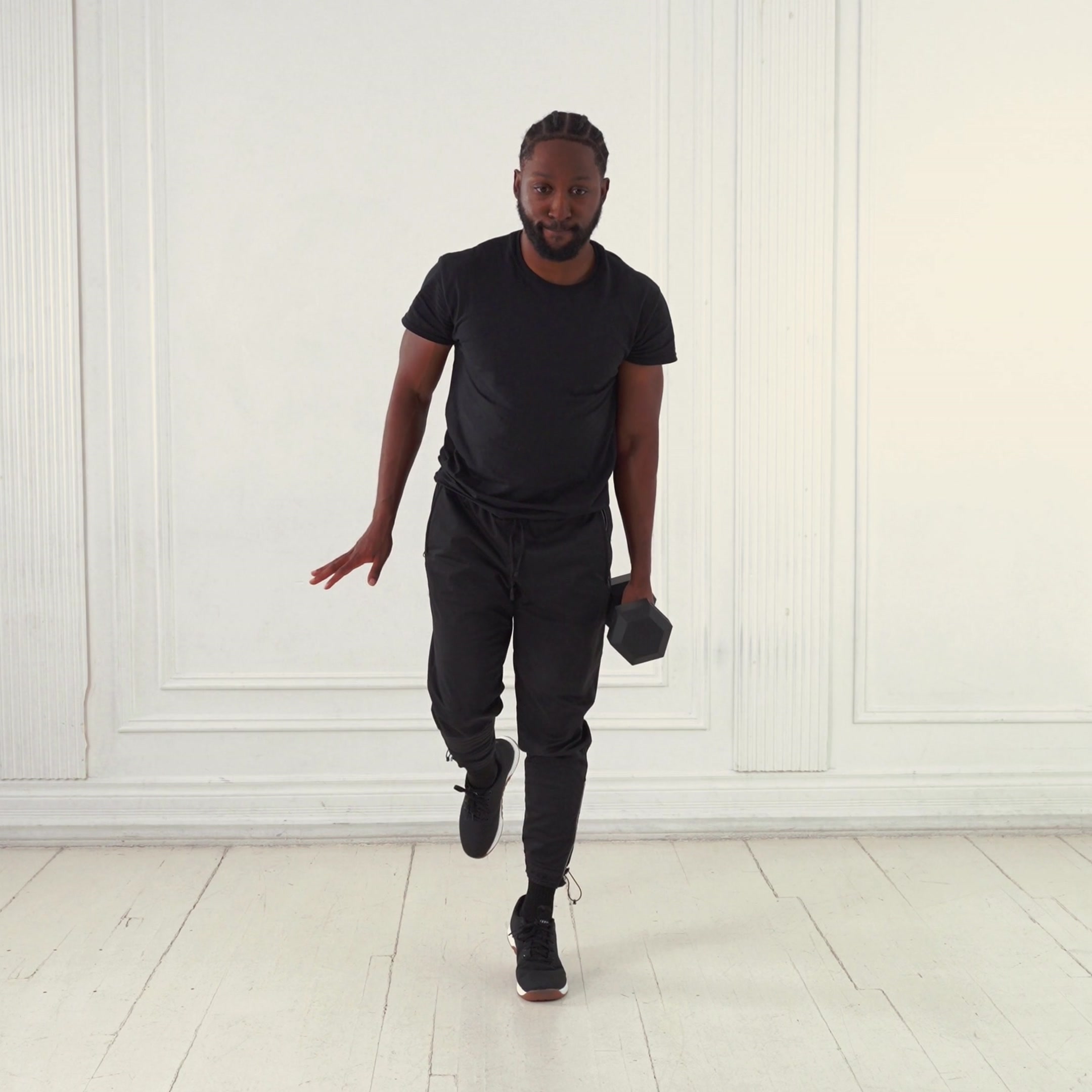 Stand tall holding jump rope handles at hip height with elbows close to sides. Lift one foot slightly off ground, keeping non-working leg in front.