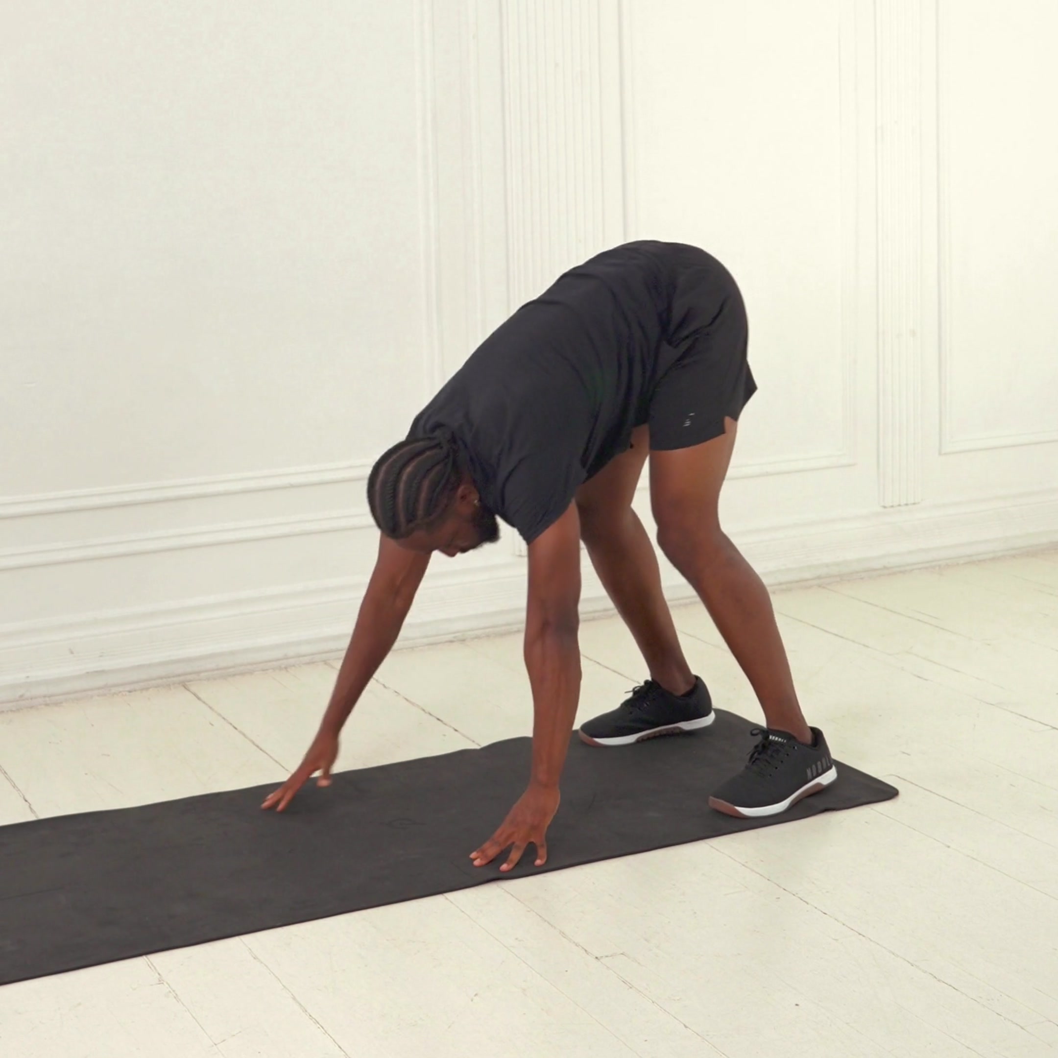 Lie on your back on a mat with knees bent at 90 degrees, feet flat and hip-width apart. Place hands across chest or lightly behind head, chin tucked, lower back pressed into floor.
