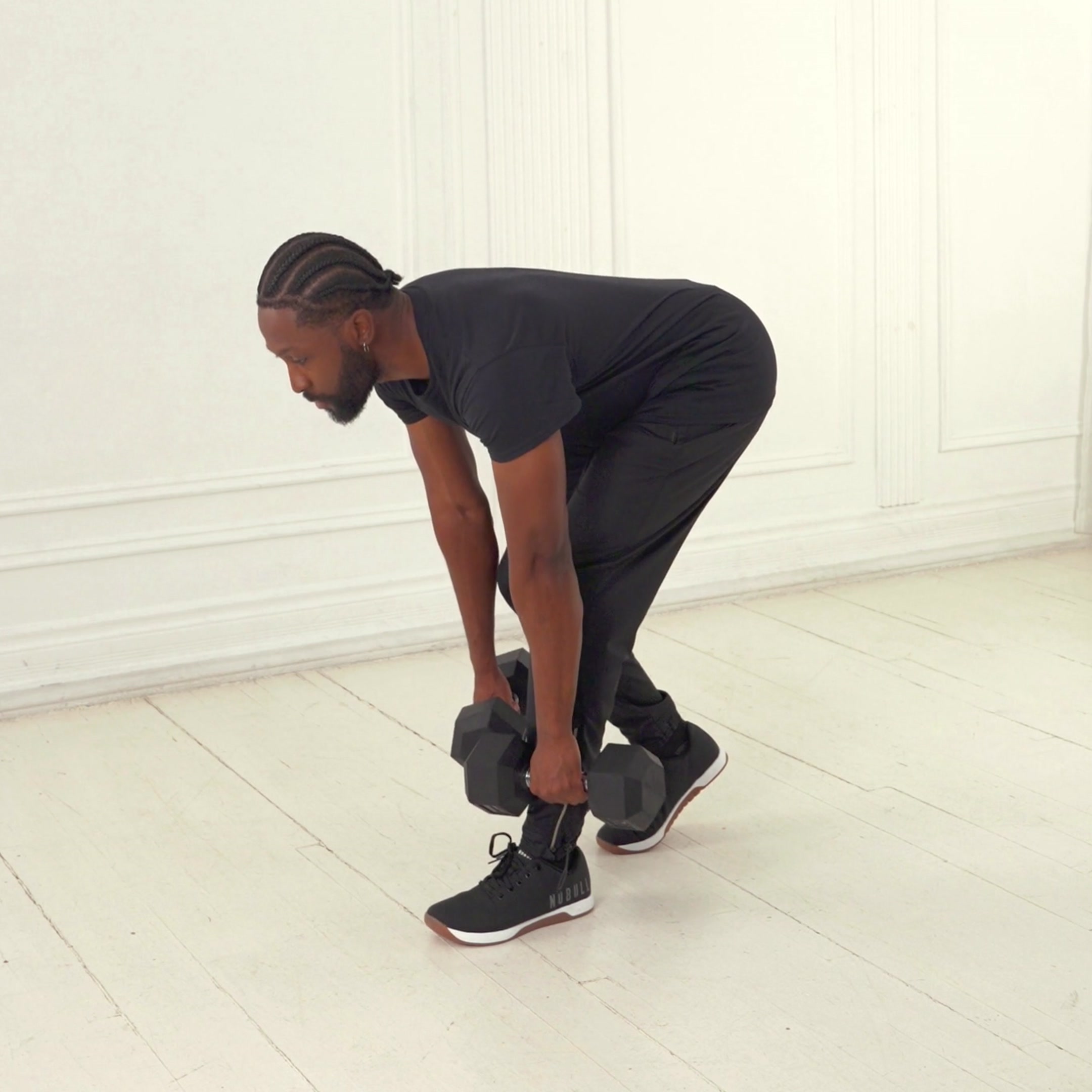Lower bar from full hip extension to mid-shin or hamstring stretch point without rounding back; return to full hip extension.