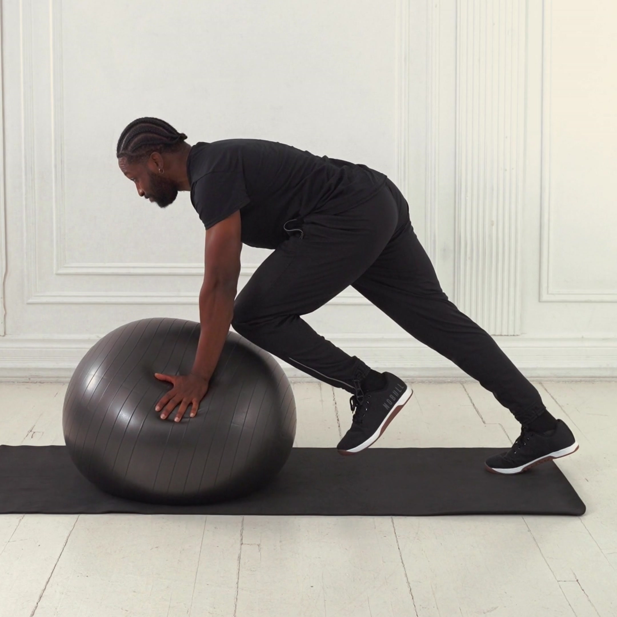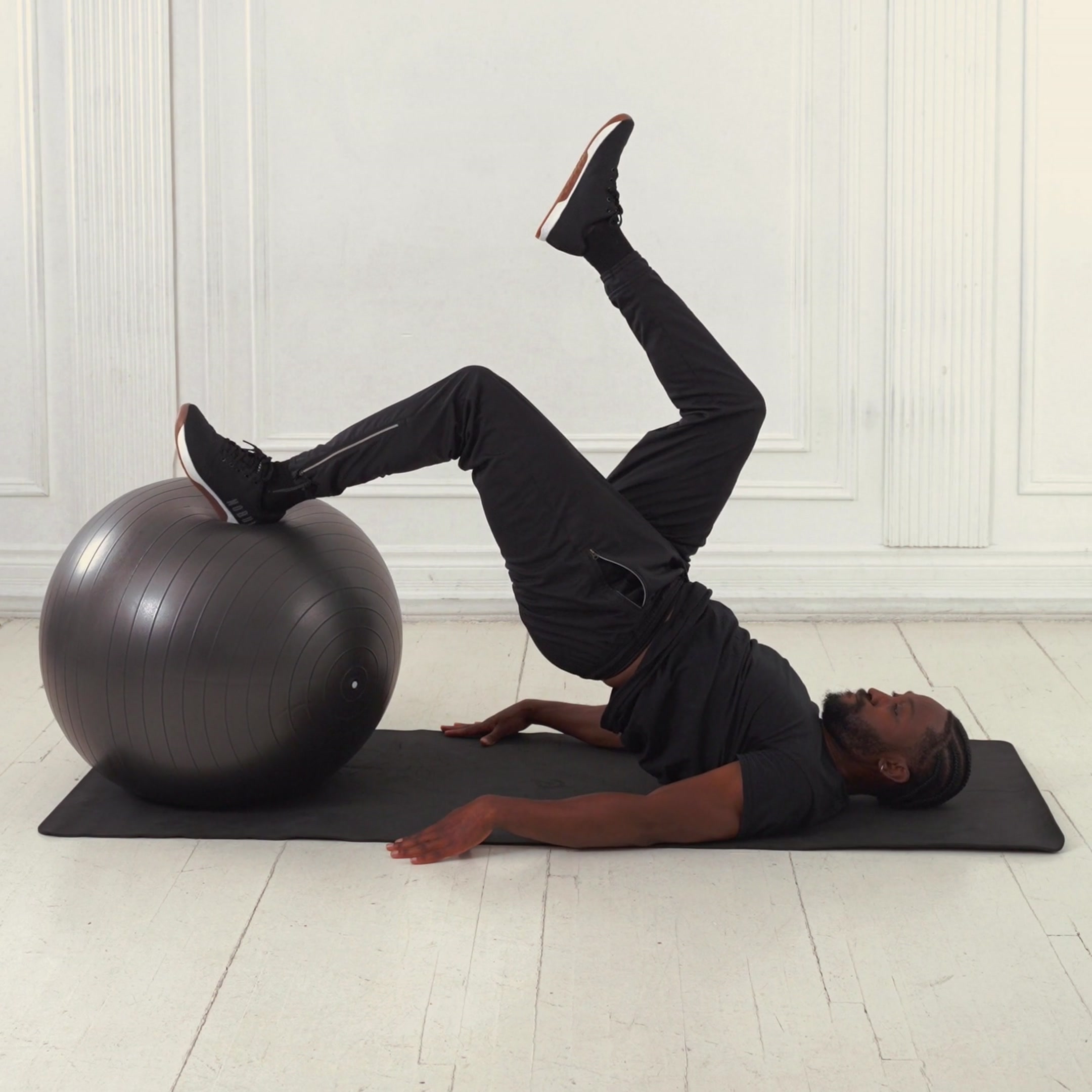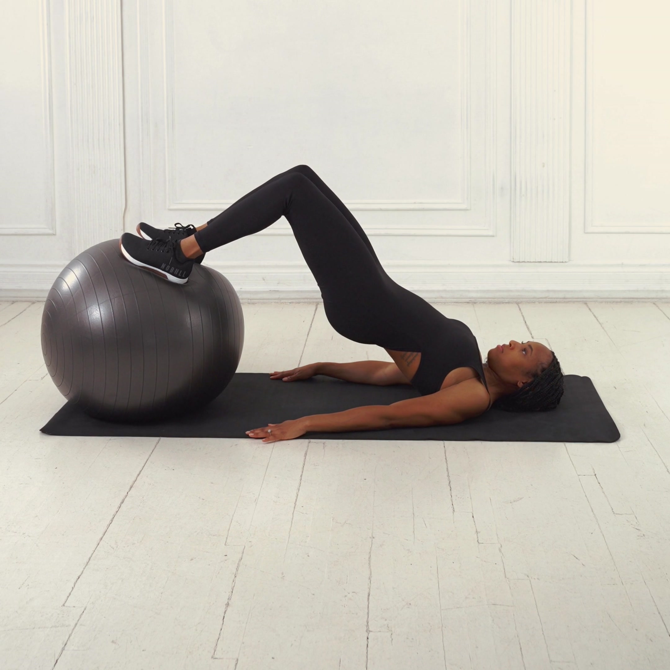 Start with torso rounded over the ball; extend to a straight line from head to heels without hyperextending the back.