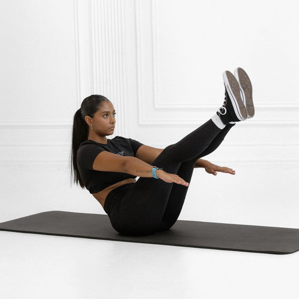 Full hip and knee flexion until knees near chest; extend to straight legs with neutral spine, no arching or sagging.