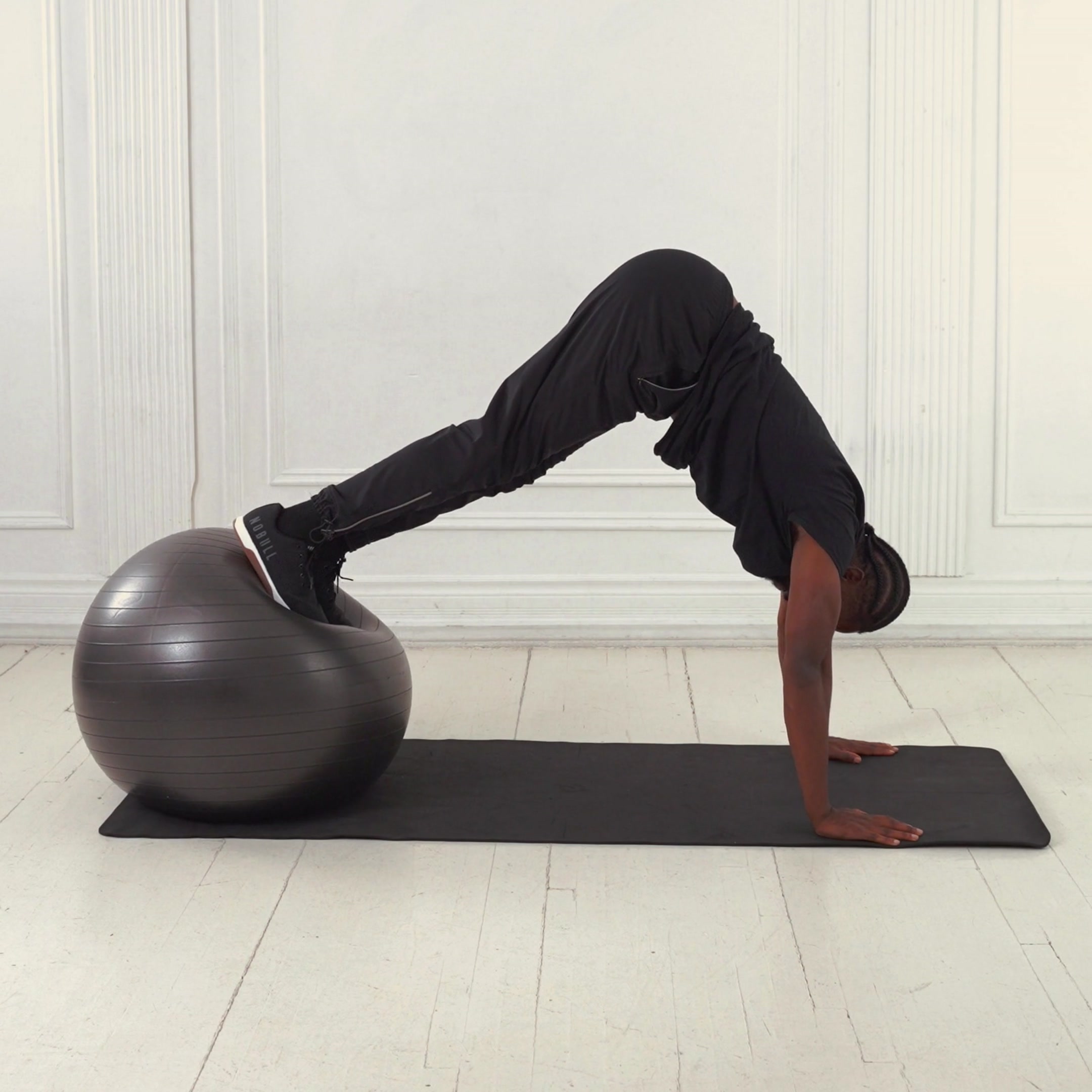 A core exercise starting from a plank with shins on a stability ball, piking hips upward to target abs, obliques, and hip flexors for strength, stability, and flexibility.