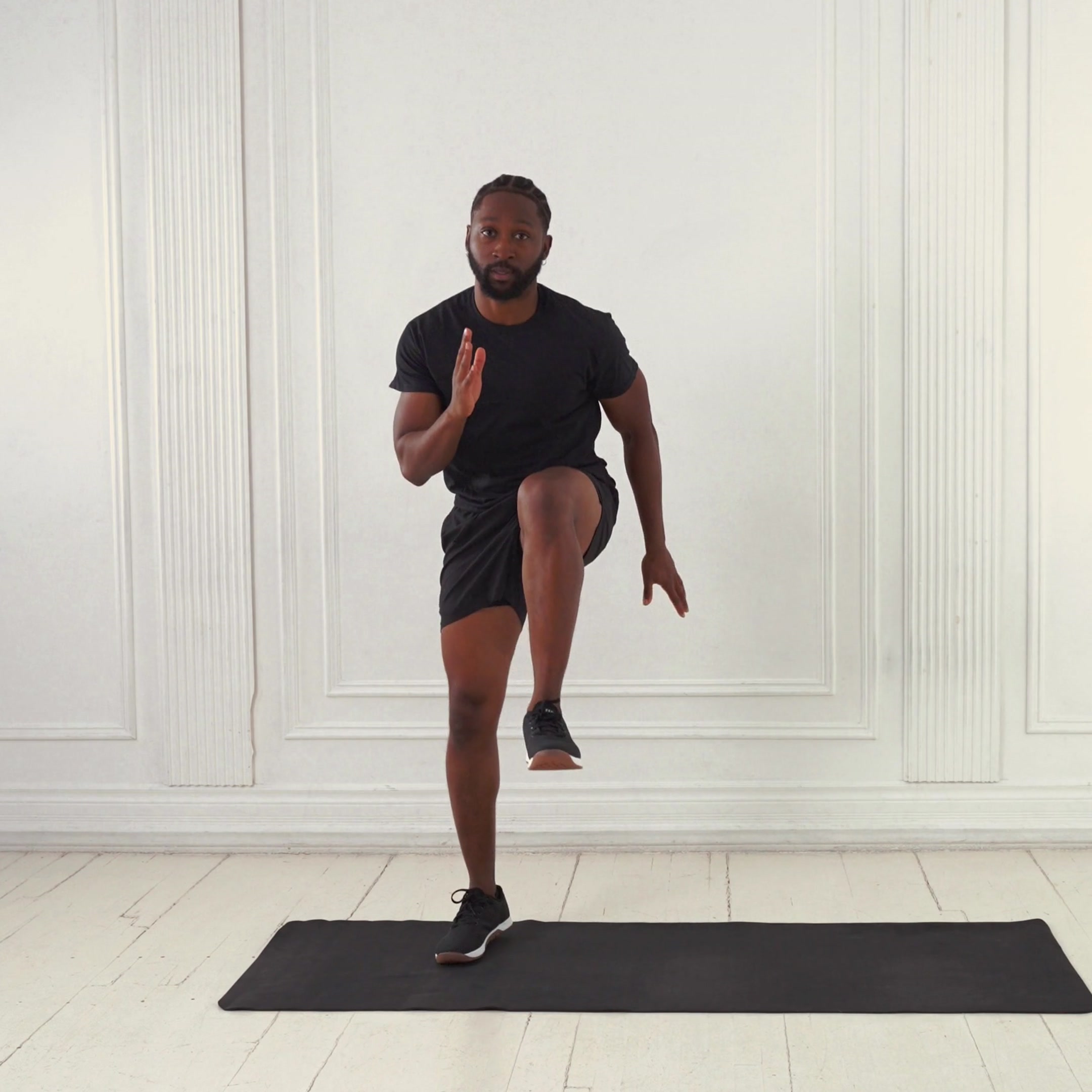 Start on all fours in tabletop position with wrists under shoulders and knees under hips on a yoga mat.