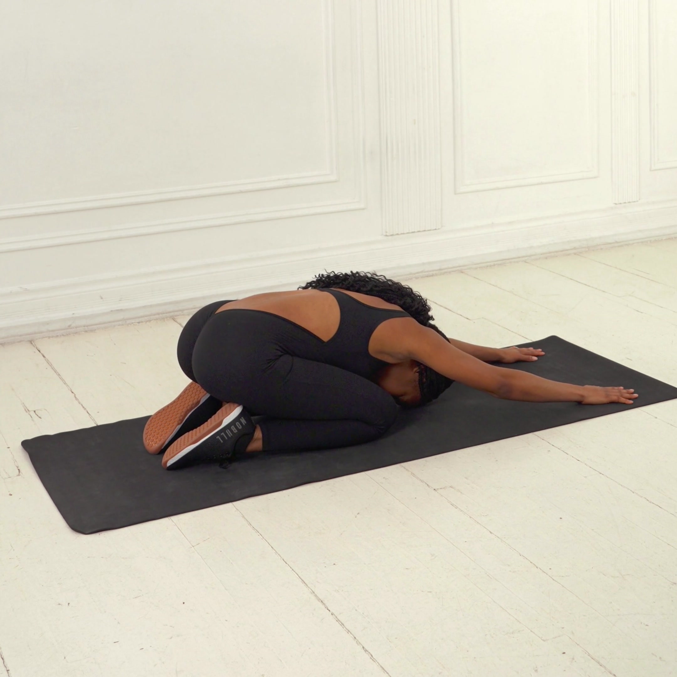 Start on hands and knees in tabletop position with wrists under shoulders and knees under hips on a yoga mat.