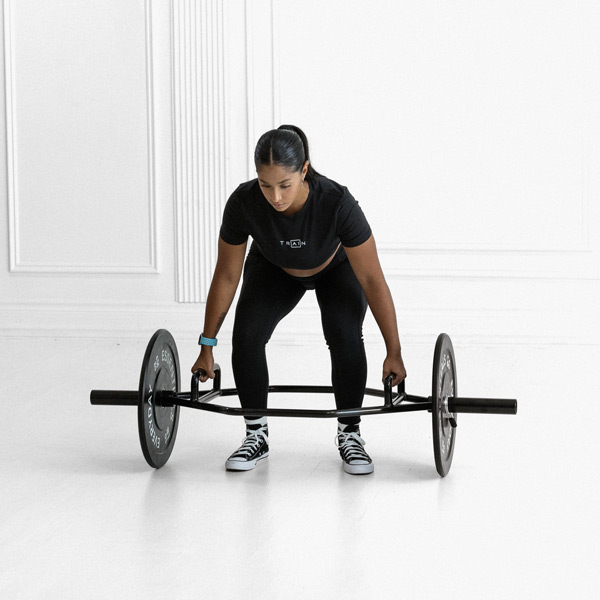 Load the trap bar evenly and stand inside it with feet shoulder-width apart. Grip the neutral handles, stand tall with knees slightly bent, spine neutral, and shoulders back.