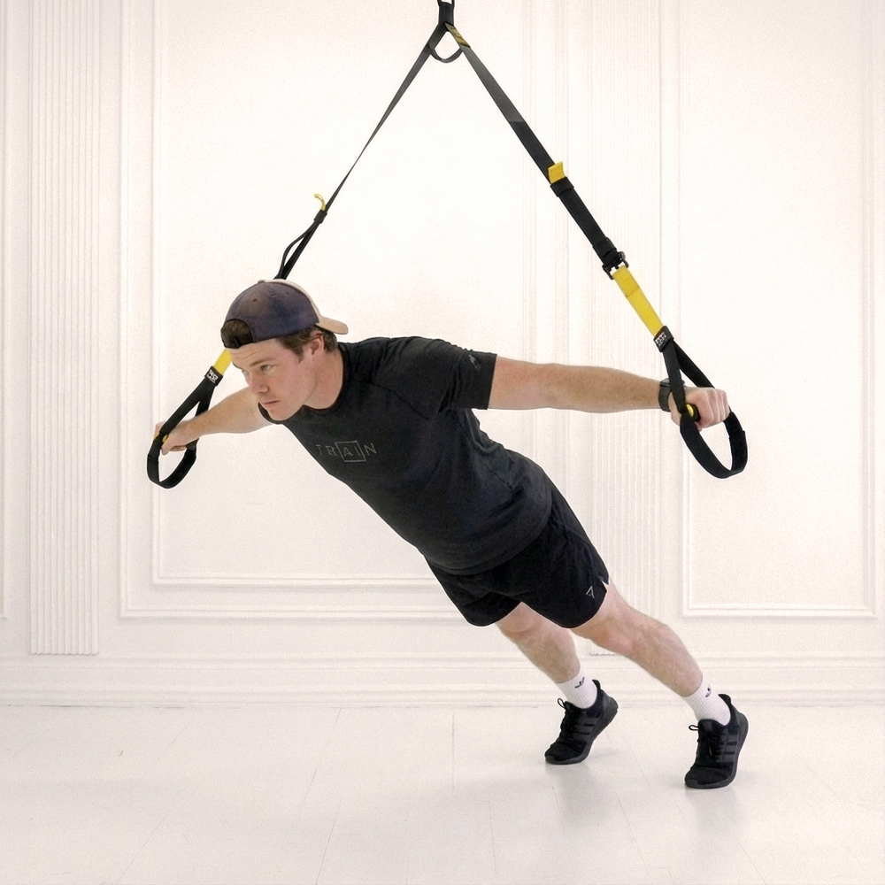 Anchor TRX straps at mid-height. Stand facing anchor, grasp handles with palms facing each other, lean back into plank position with body straight and arms extended.